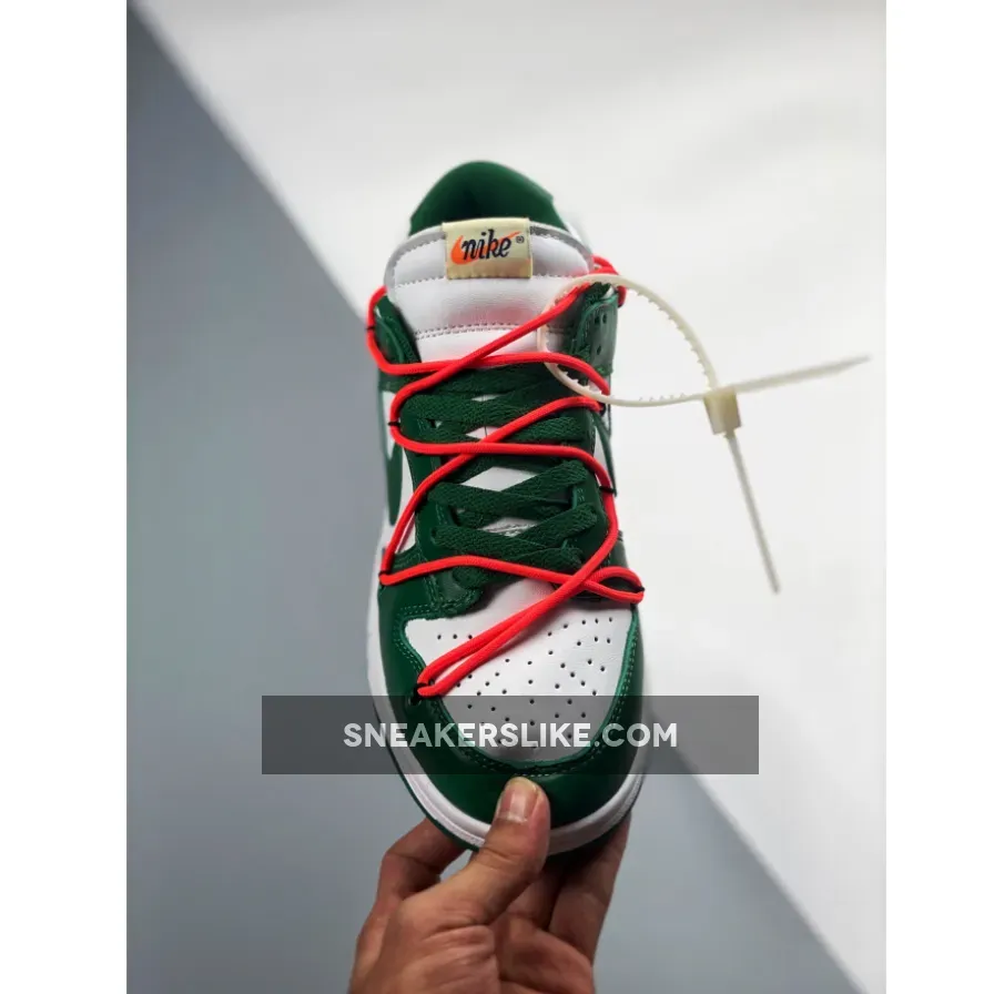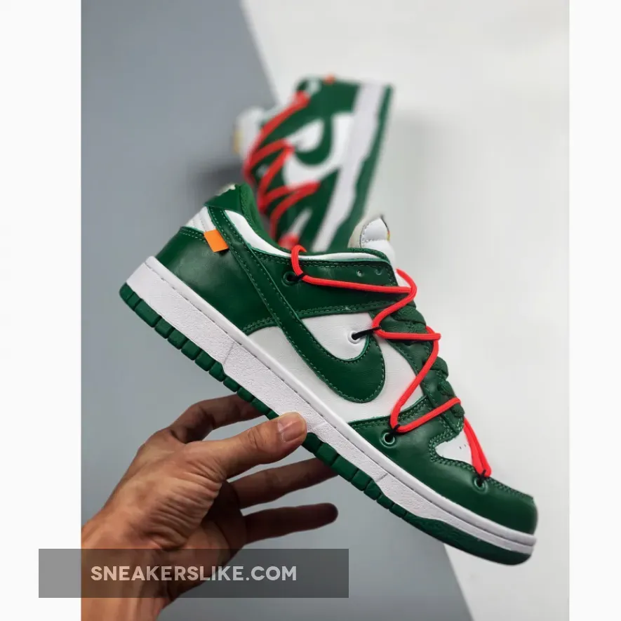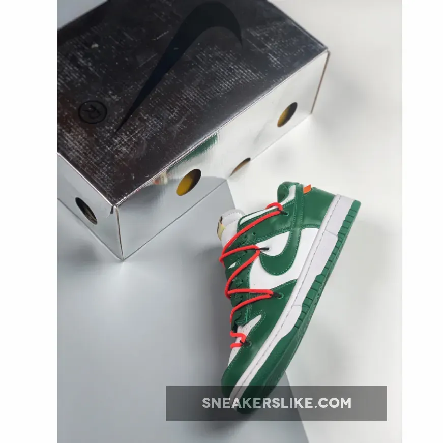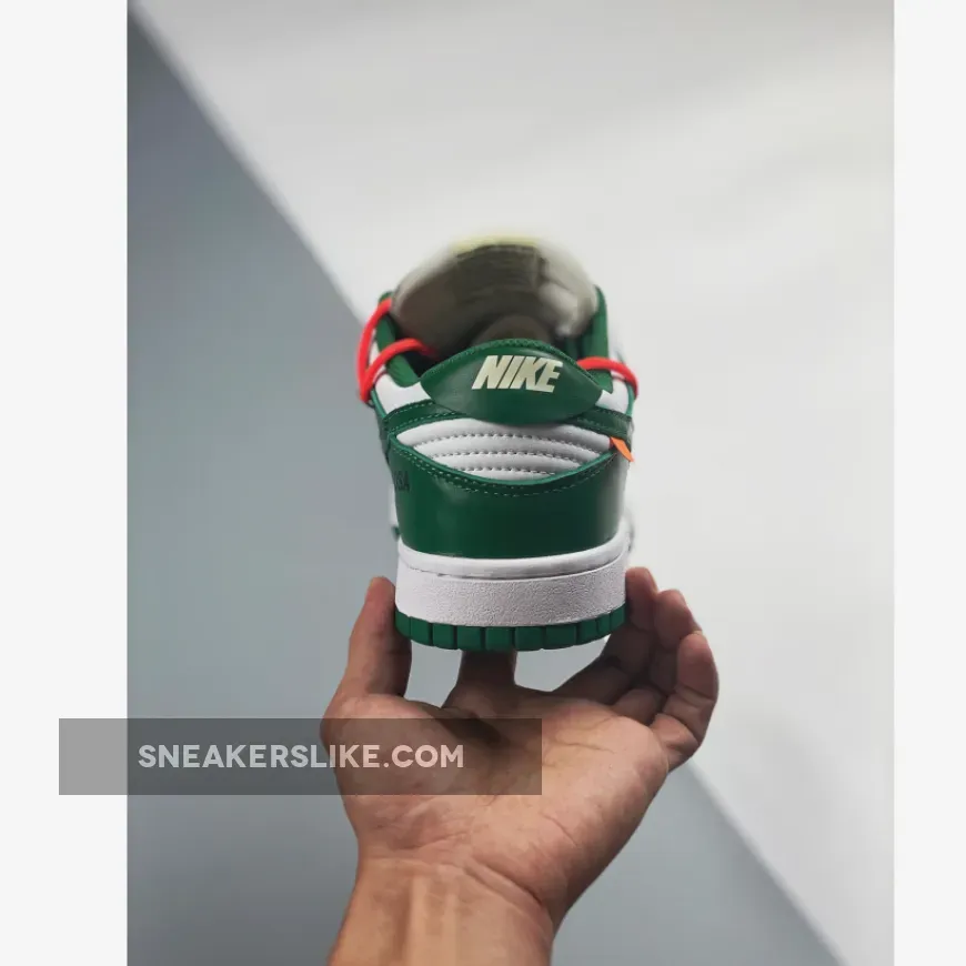Virgil Abloh explores the art of deconstruction and recreation with a three-piece capsule collection of the Off-White x Nike Dunk Low. Launched in December 2019, this version is given a Pine Green and white leather upper, bold branding on the medial and an orange-flagged Swoosh across the lateral. Bright secondary Flywire lacing and a raw-edge tongue channel Abloh’s signature aesthetic.