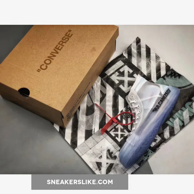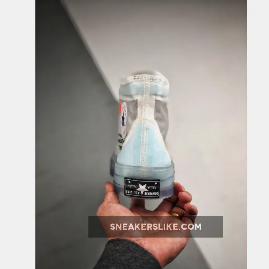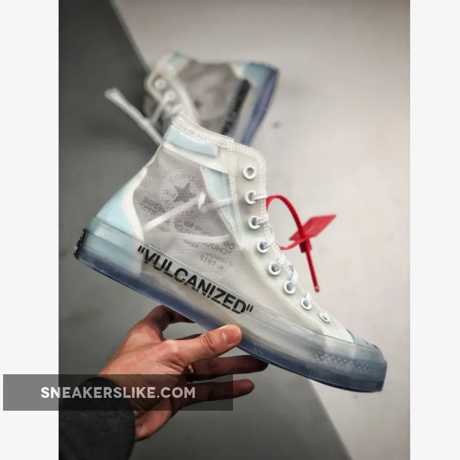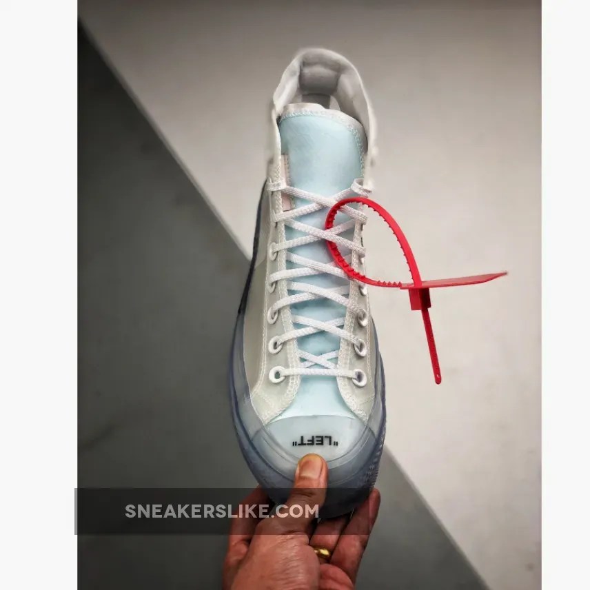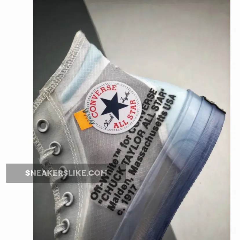 Dressed in a Clear and White color scheme. The Off White x Converse Chuck Taylor sports a reconstructed translucent upper with a semi-revealing material that ties into the theme.