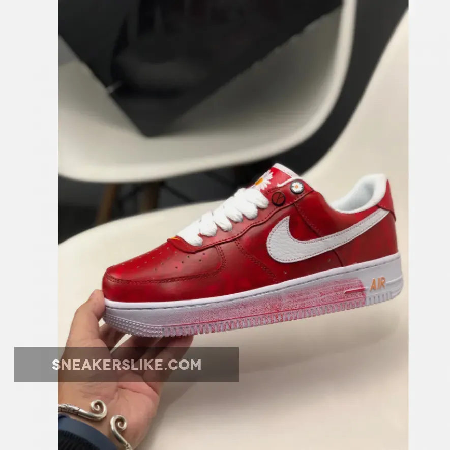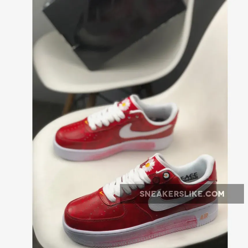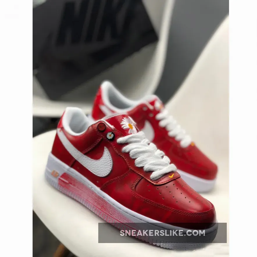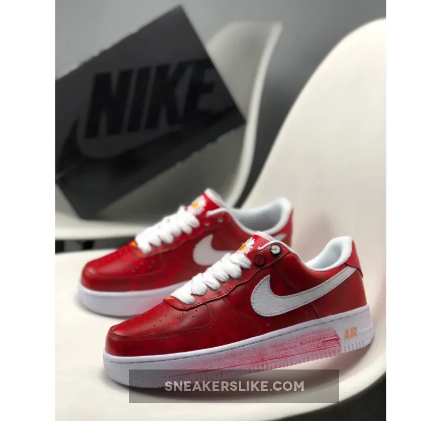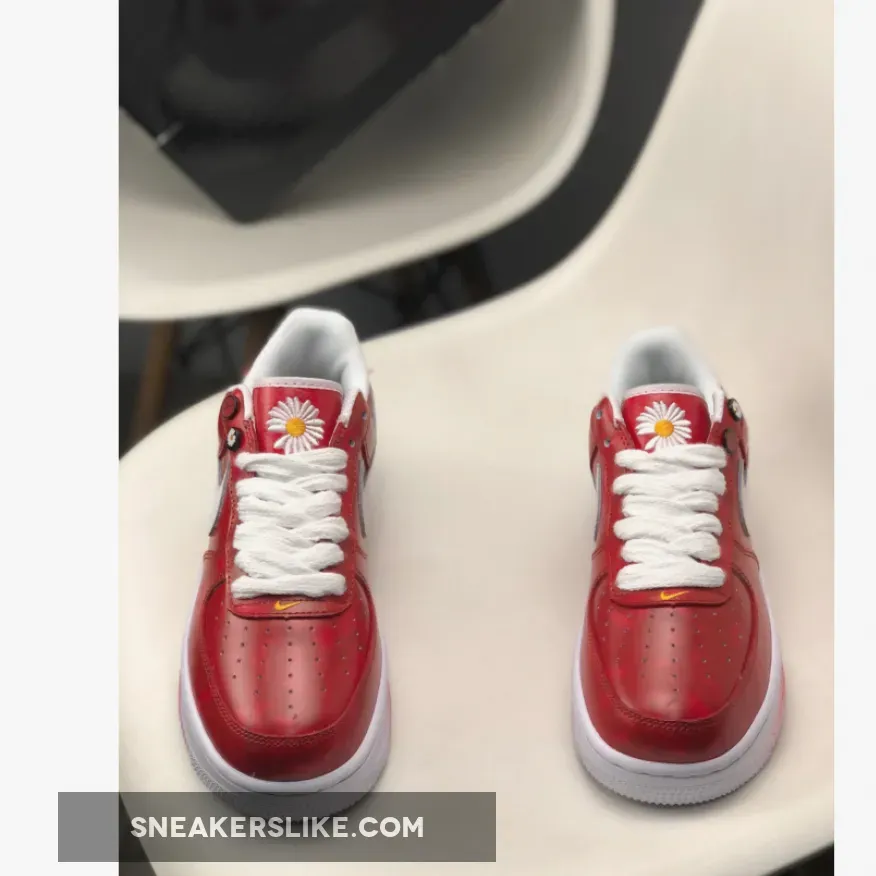 . The mini Swoosh and center of the daisy also arrive in yellow. There’s no word on if this pair also features the same unique hidden artwork underneath the paint but we can see uneven layers of red, giving an impression of a pattern of blotchy brushstrokes.