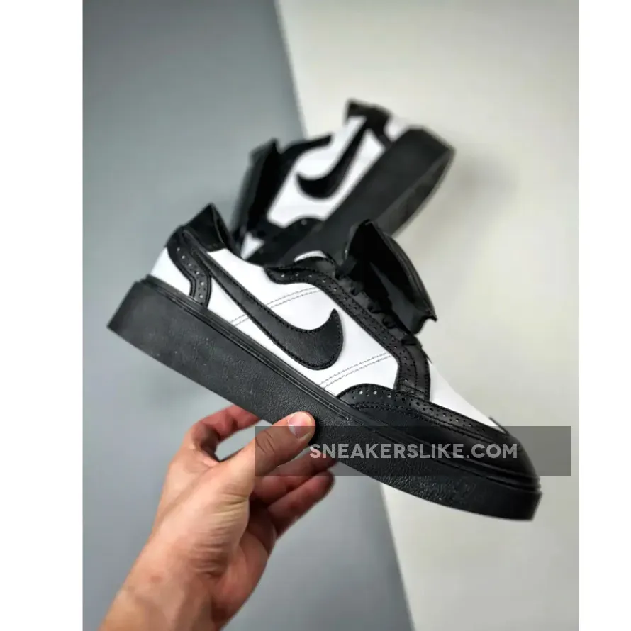 The base is dialed to a crisp white while the leather overlays, Swooshes, thick lace shrouds, bottoms and wing tip toe boxes contrast with a solid black hue.