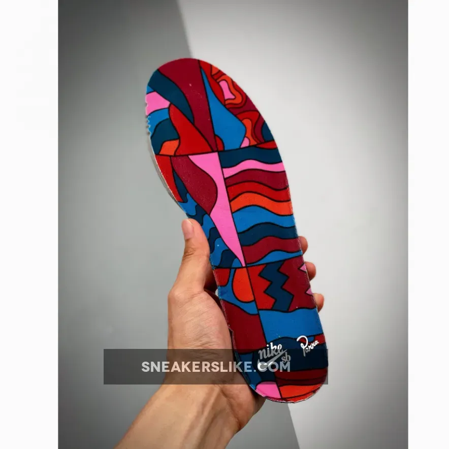 Each shoe equips white leather quarter panels, toeboxes and collars, and uses a shorter-than-usual black leather Swoosh on the midfoot. However, suede overlays differ vastly on each foot. The right shoe mixes cool blue and blue-green shades with just a dash of red, while the left shoe offers a much warmer mixture of pink, orange and red tones. Forefoot and heel branding diverges as well, with the right shoe using Parra’s script logo on the mudguard and a Nike hit on the heel while the left shoe supplies a mudguard mini Swoosh and a Parra heel hit. Both are rounded off with a printed pattern on the tongue tag and trim plus white midsoles and gum outsoles.