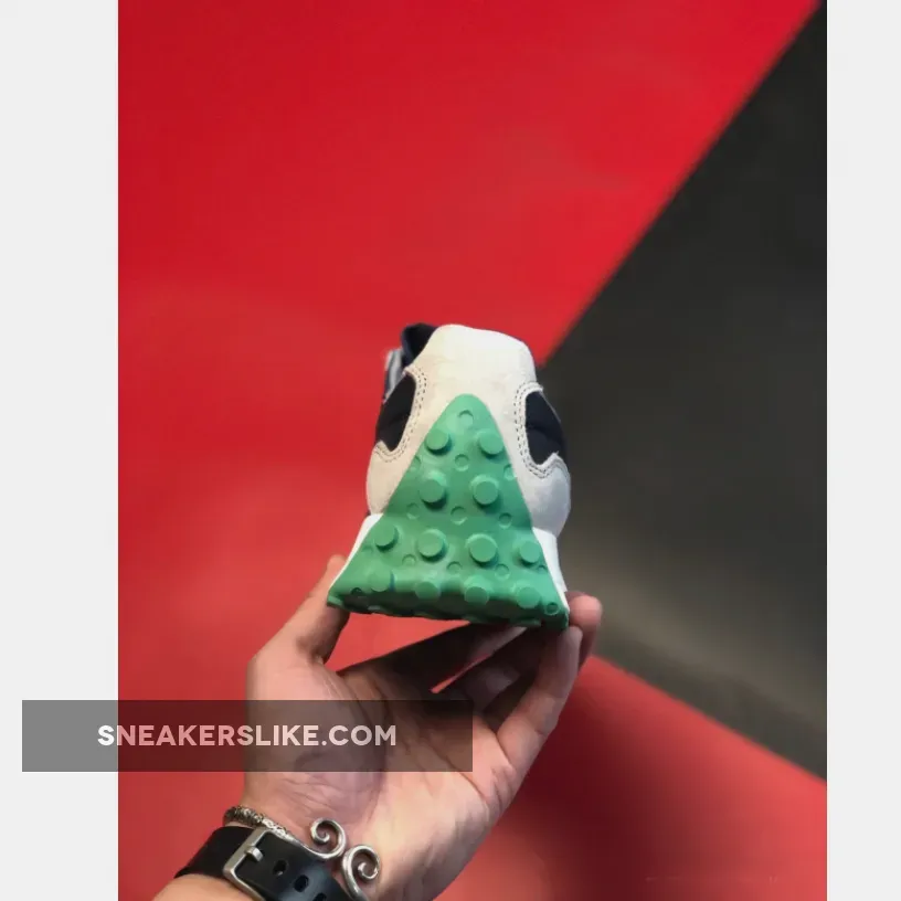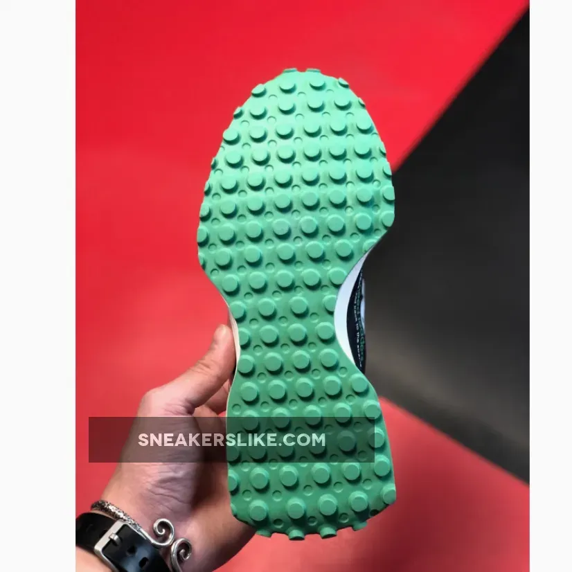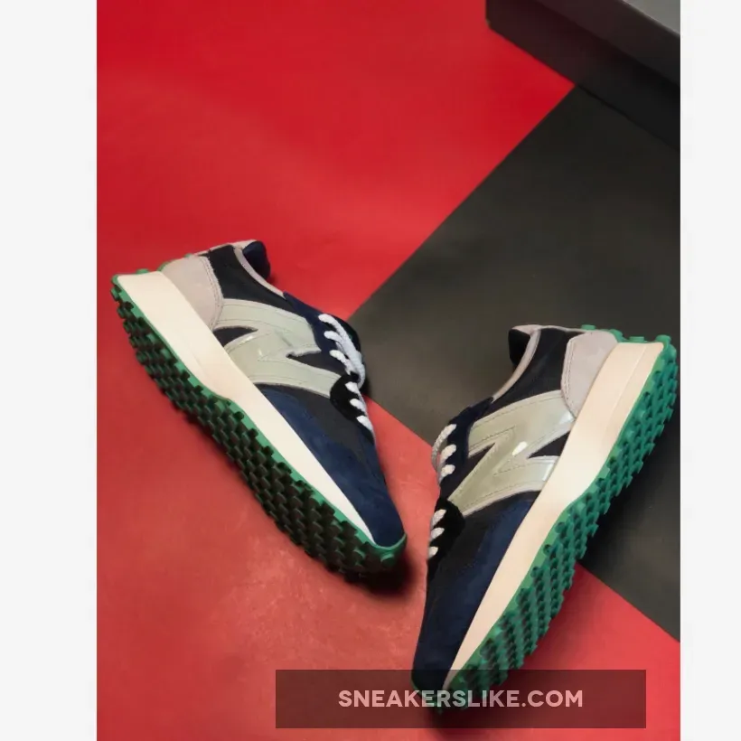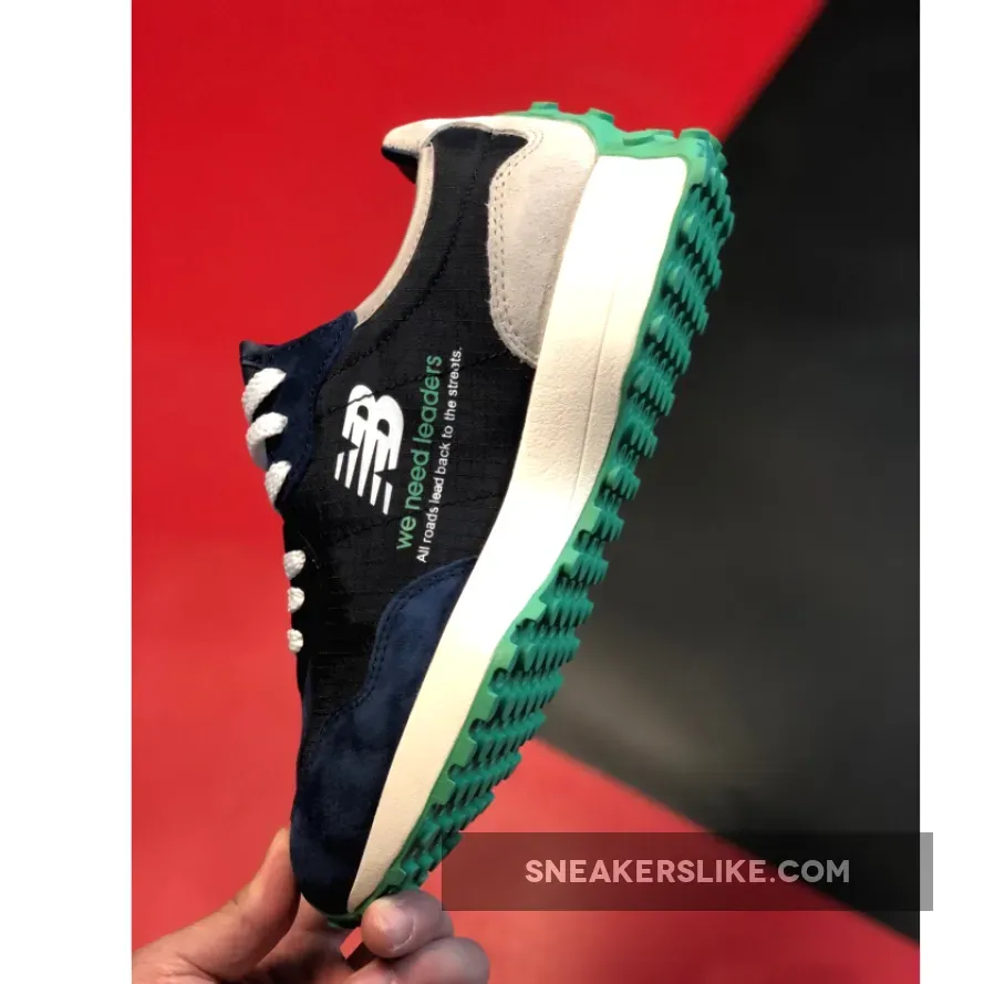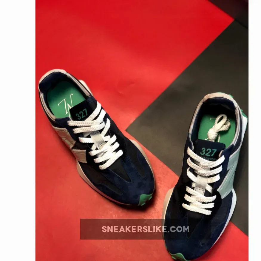 PSNY’s New Balance 327 features a Navy mesh base with Navy and Grey suede overlays detailed with Green accents on the “N” logo and rubber sole.