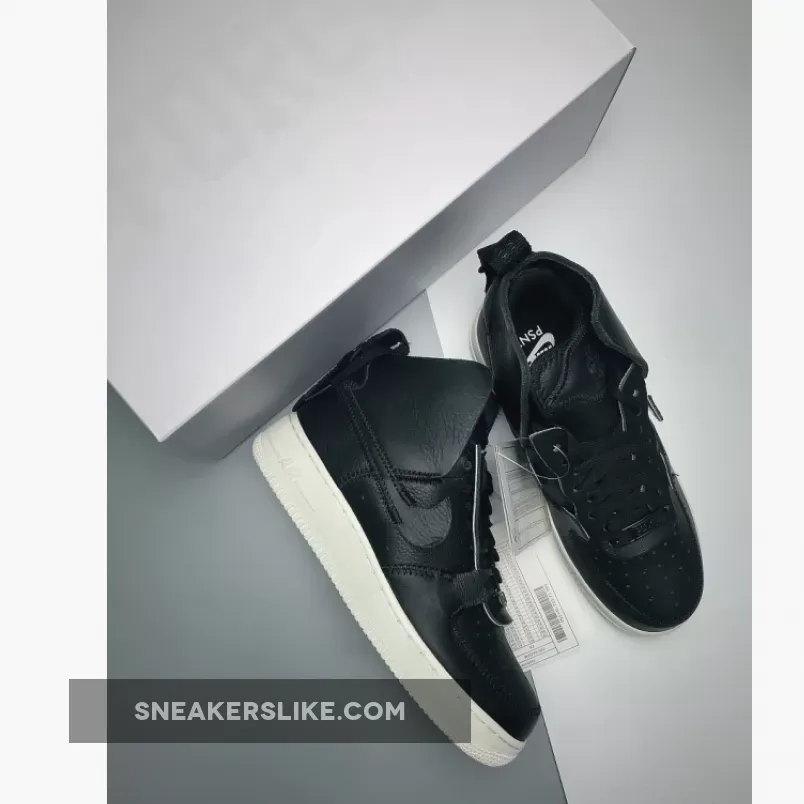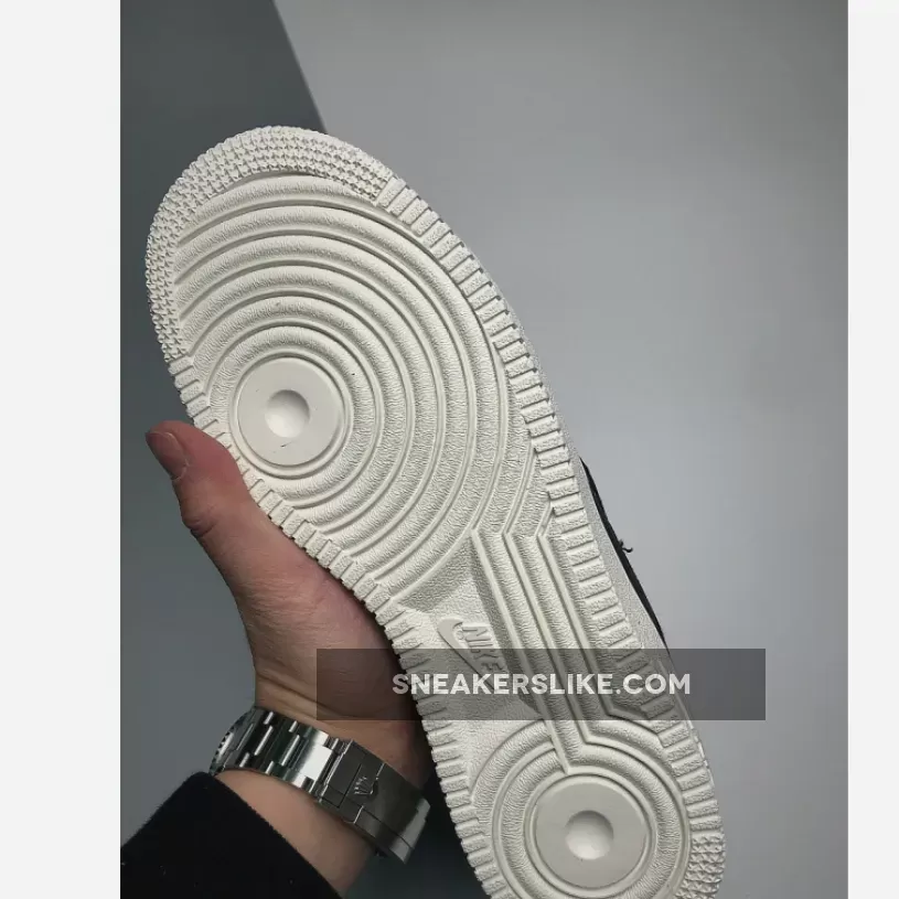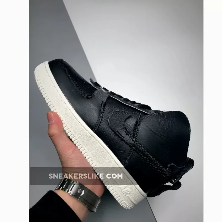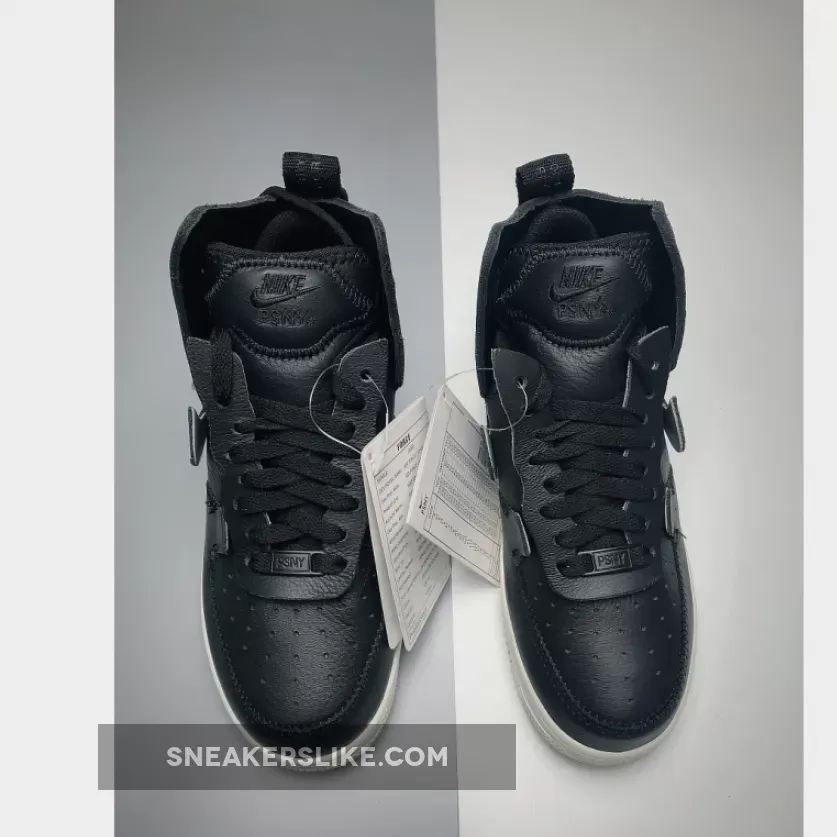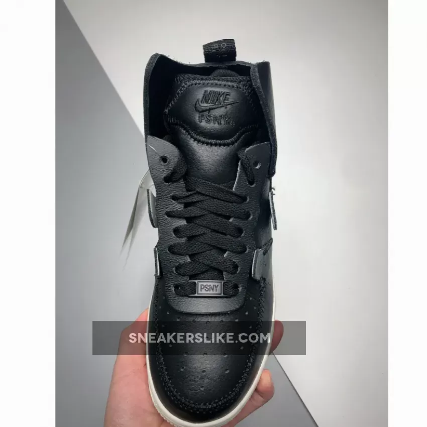 The shoe’s interesting upper — which boasts a mix of features from the AF1 High, Mid, and Low for a pieced together look — arrives in a premium black leather or grey leather/suede combo, both with thick stitched seams to accent the handmade aesthetic. The midfoot swoosh hangs off on the quarter panel, and the mudguard’s tabs extend up past the throat — which itself boasts an interesting raised design. An Air Force 1 Mid-style strap appears on the heel, and special PSNY branding adorns both the tongue and the lace deubre.
