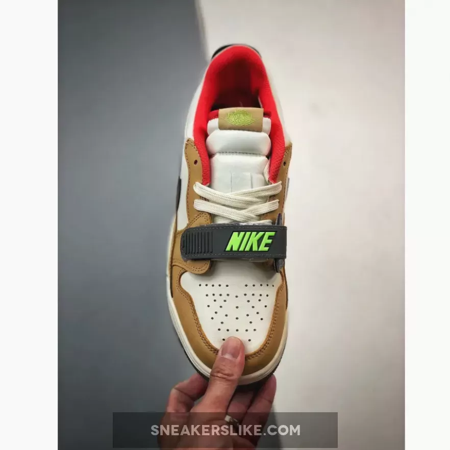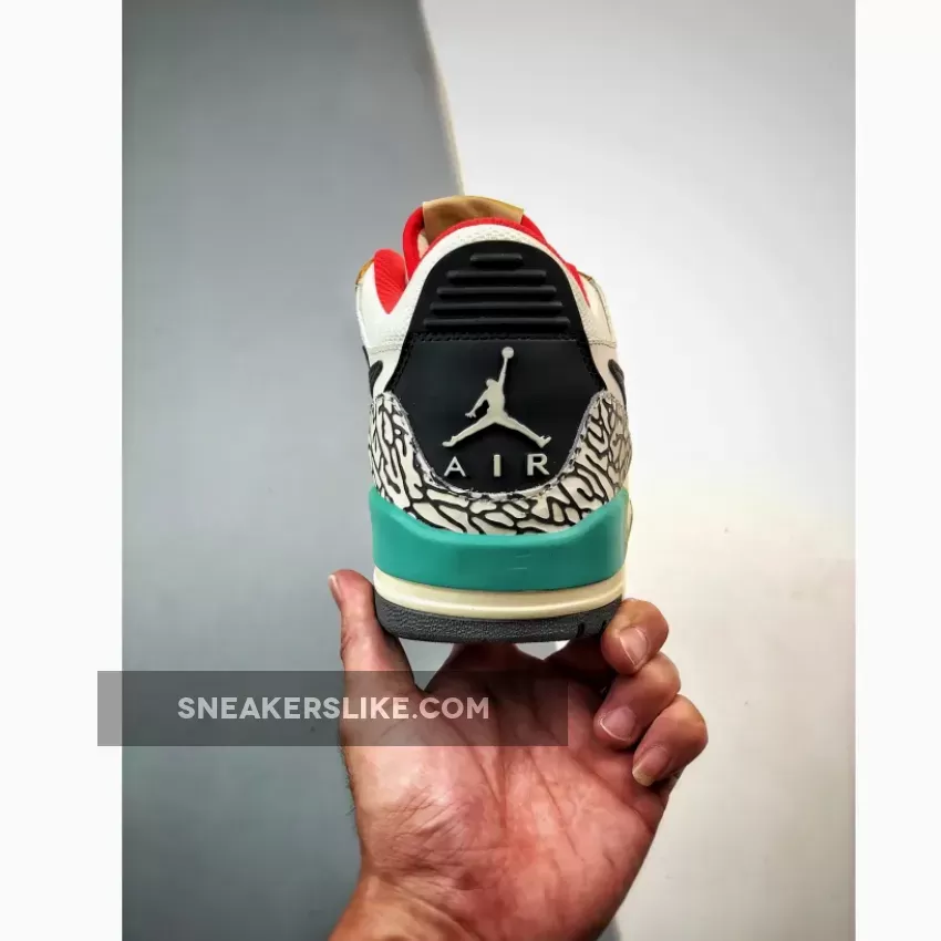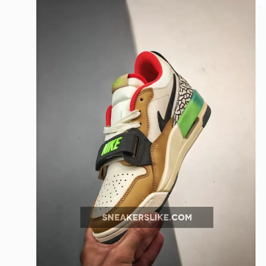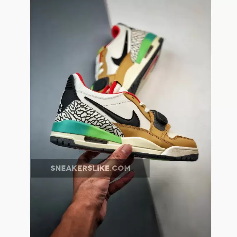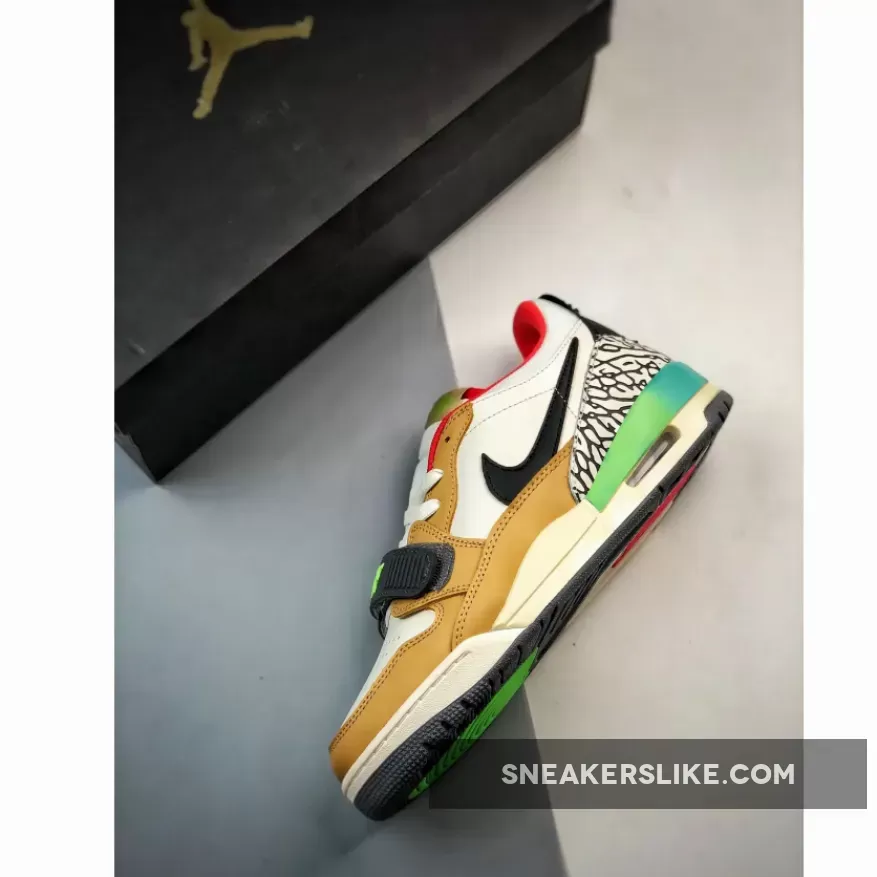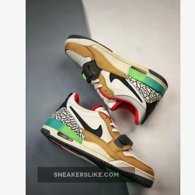 The Jordan Legacy 312 Low Gradient Multi inspires you to never hold back when it comes to showing off your eccentric style. This vibrant pair starts with a typical smooth white leather base with a classic black Swoosh and perforated toe. Adding an elegant touch are tan overlays that surround the toe, mudguard and eye stay areas. Meanwhile, the heel is decorated with the iconic “Elephant” print which goes well with bold orange-red accents at the padded collar and tongue. The finishing touch is a stylish teal and lime green TPU heel tab that also provides extra support. Rounding off this Jordan Legacy 312 Low is the black and white sole unit with a visible Air bubble that delivers all-day comfort.