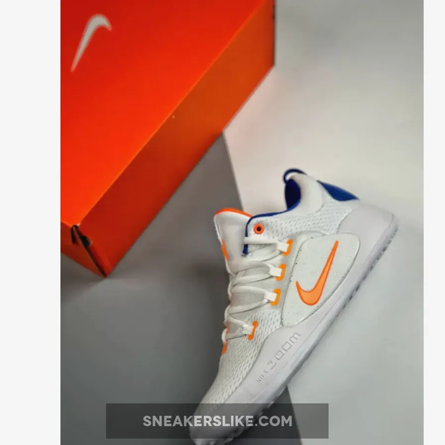 This particular pair features an all-white makeup with blue at the inner lining and orange speckling at the midsole clip, which is topped off with a Orange Swoosh.