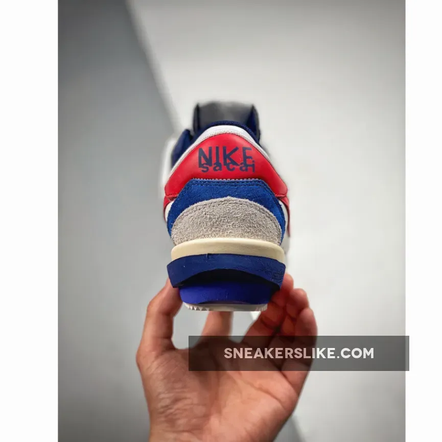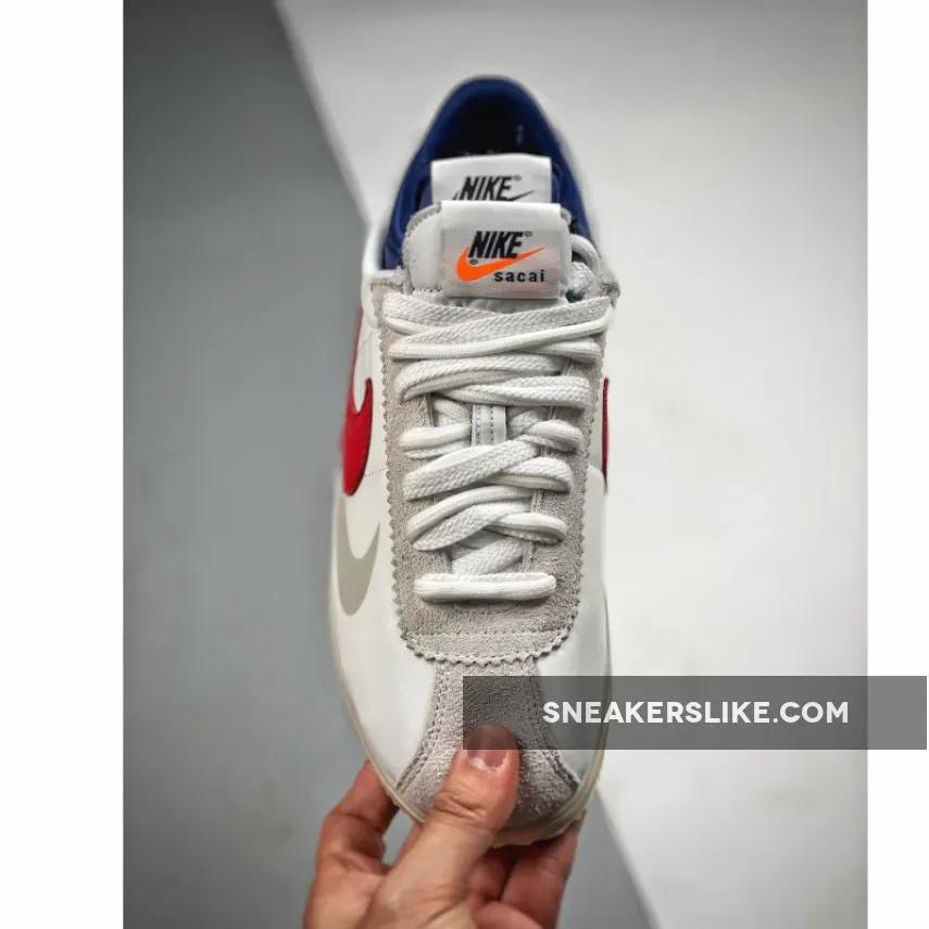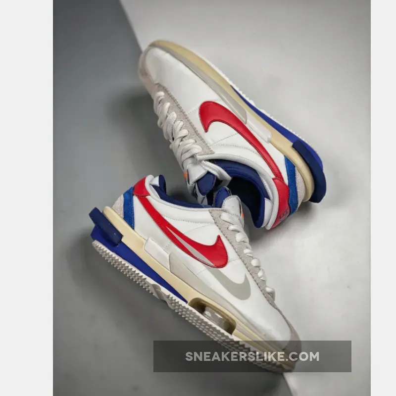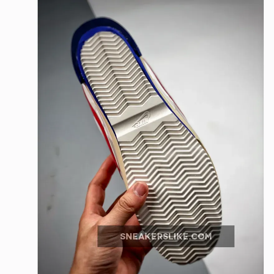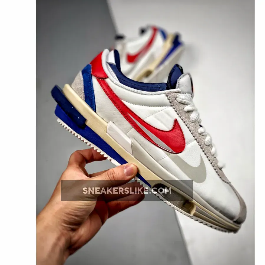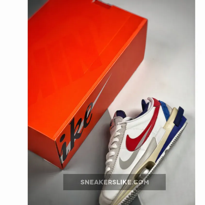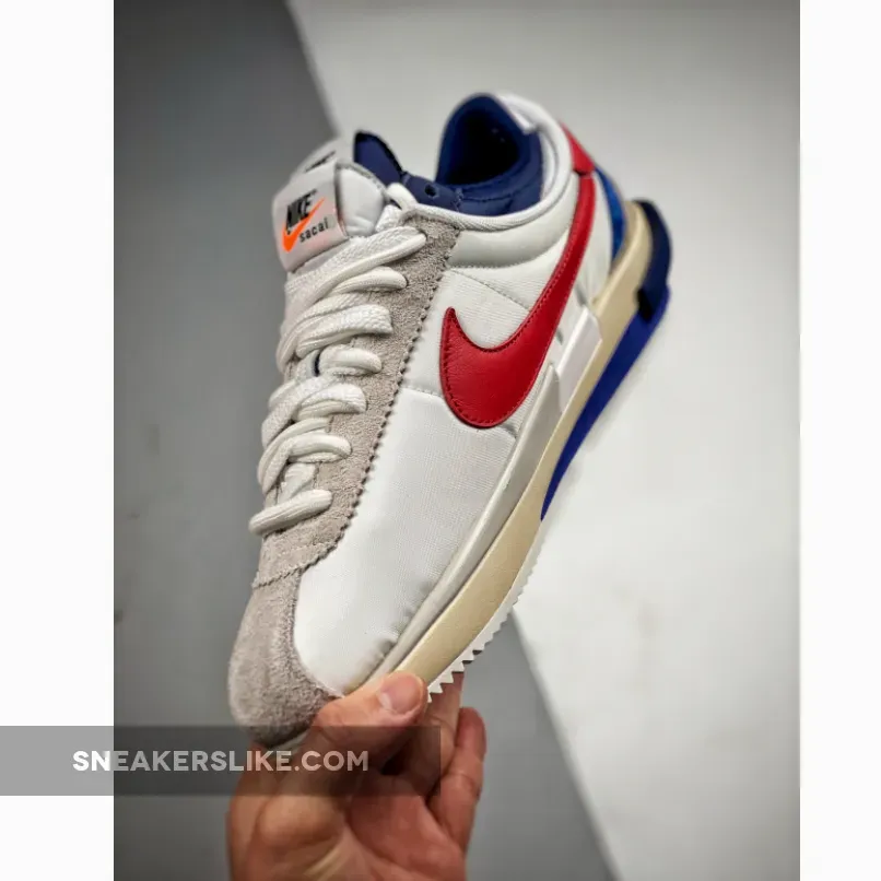 Dressed in an OG color blocking, the Sacai x Nike Cortez features a White leather base with Grey suede overlays paired with Red and Blue contrasting accents. Other details includes double-layering similar to the LDWaffle, Blazer ad VaporWaffle collabs. Co-branding with visible Zoom Air in the forefoot housed in special packaging completes the design.