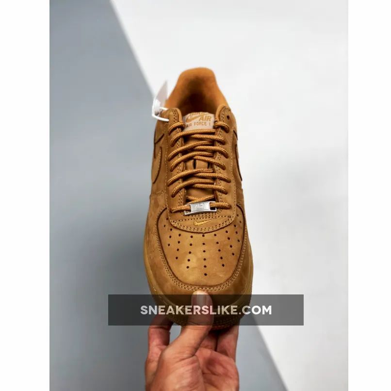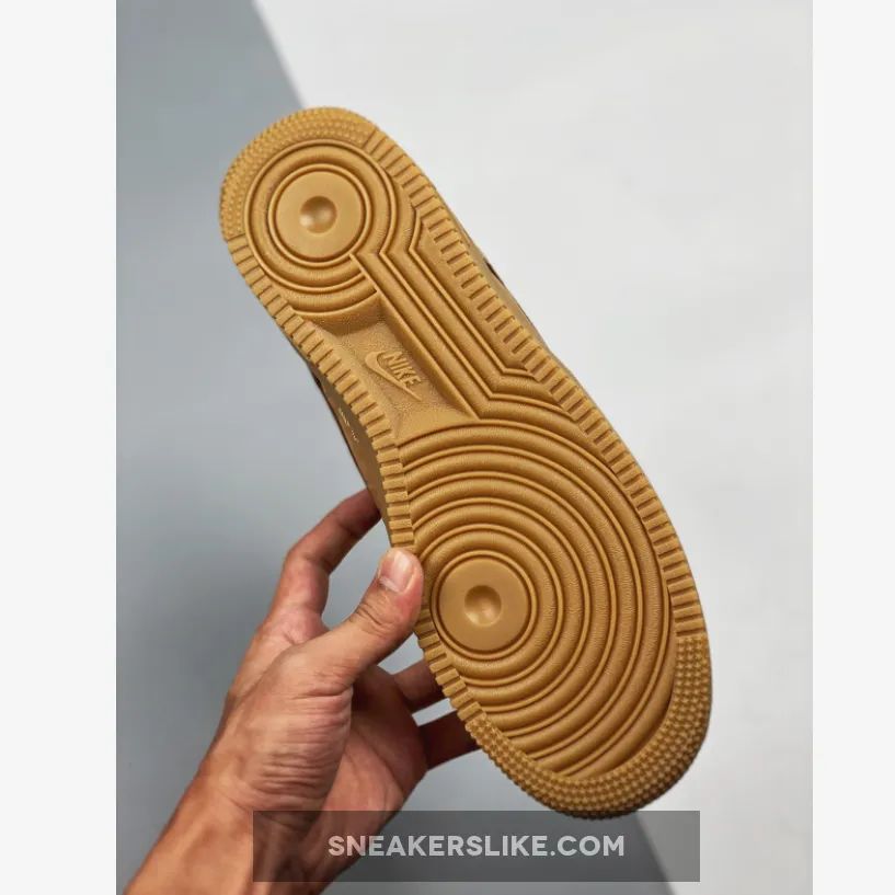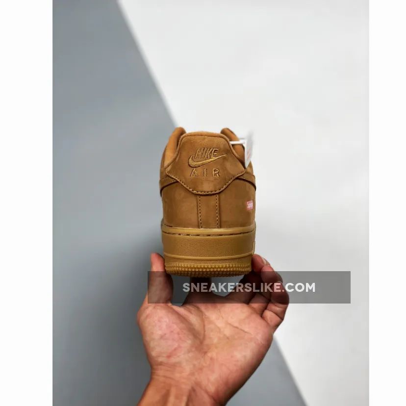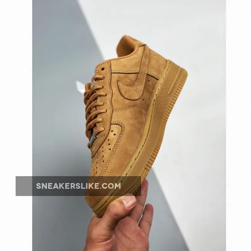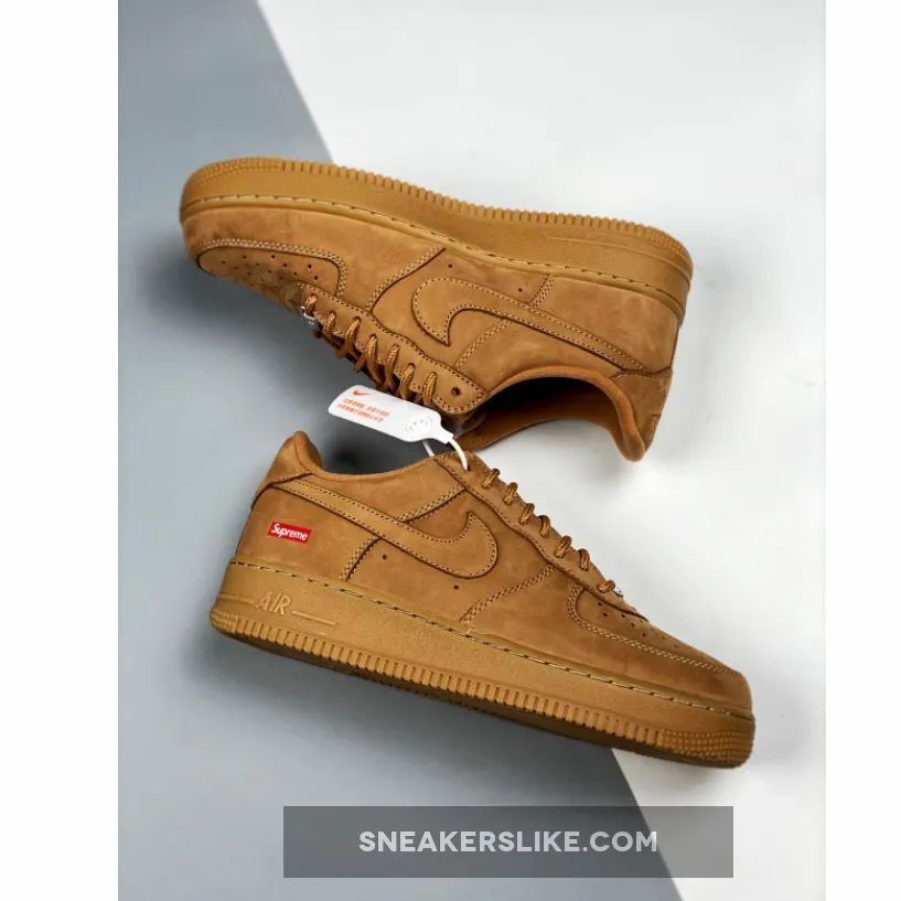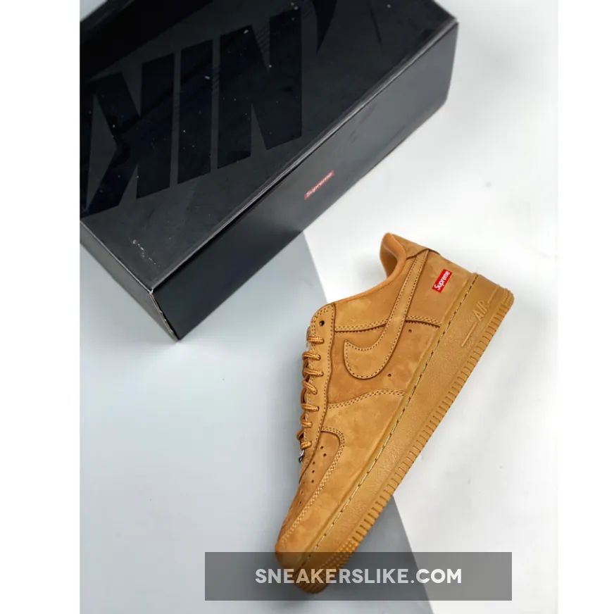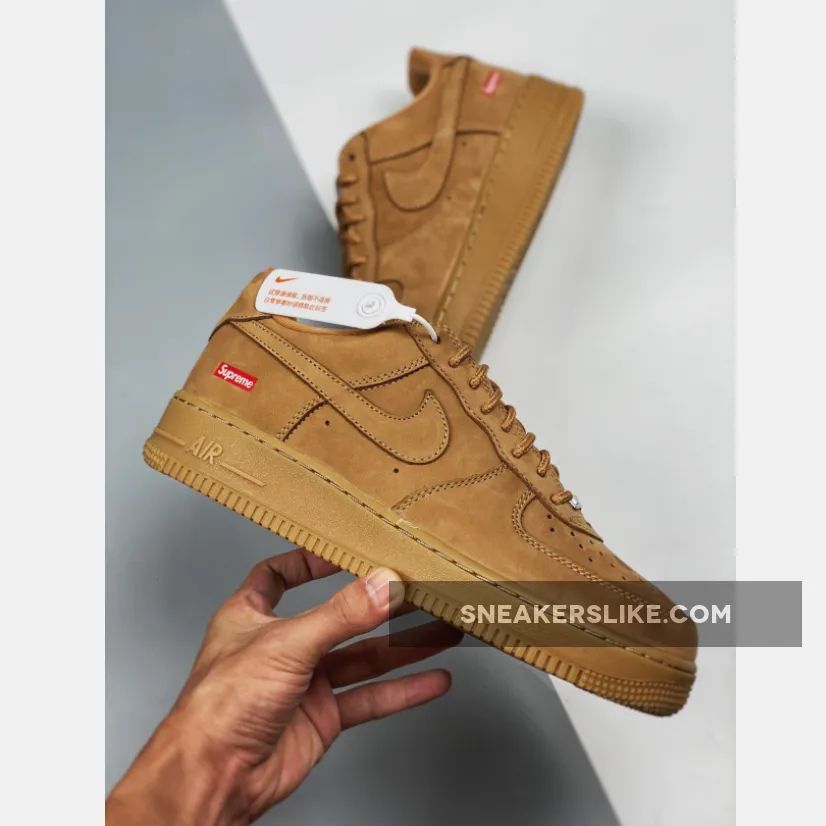 This “Flax” edition of the Supreme x Nike Air Force 1 Low features a full Wheat-colored upper paired with boot-styled laces and metal upper eyelets.