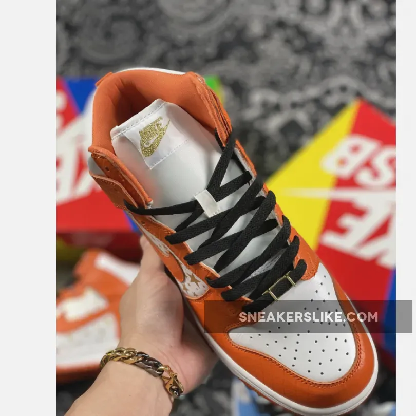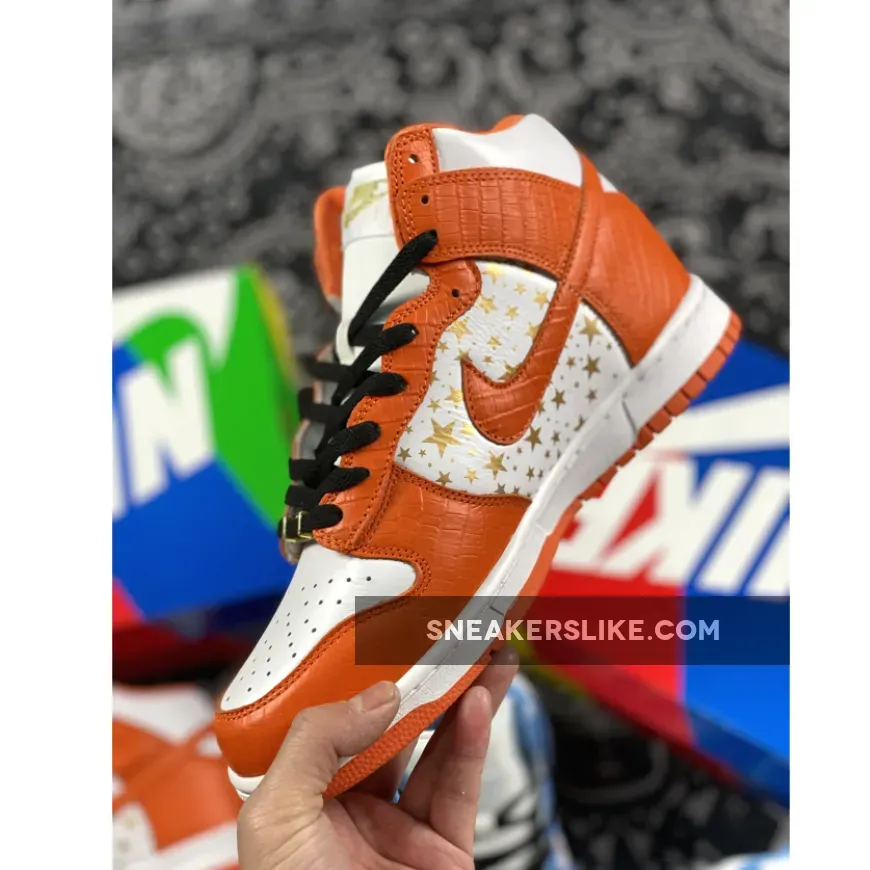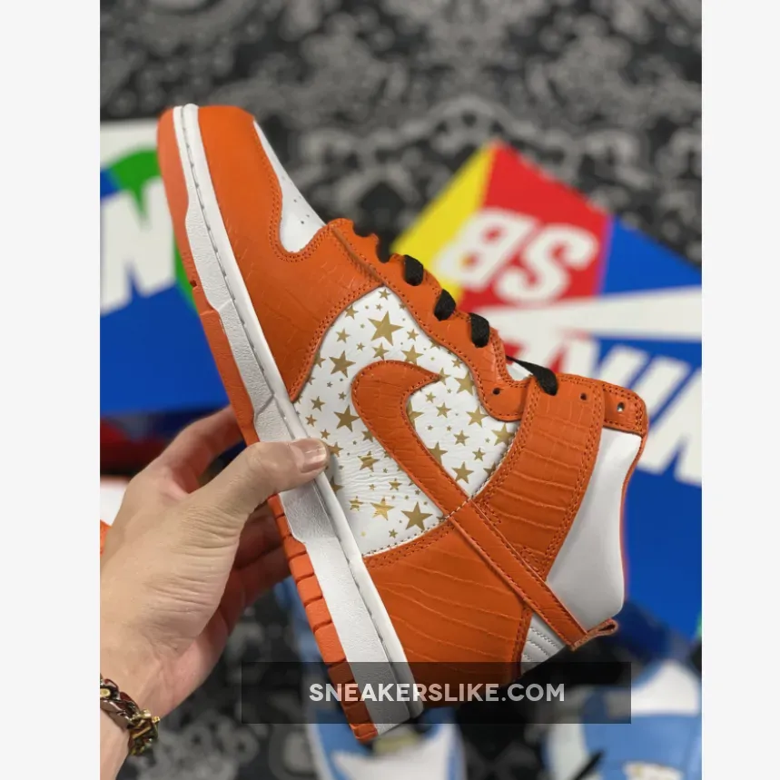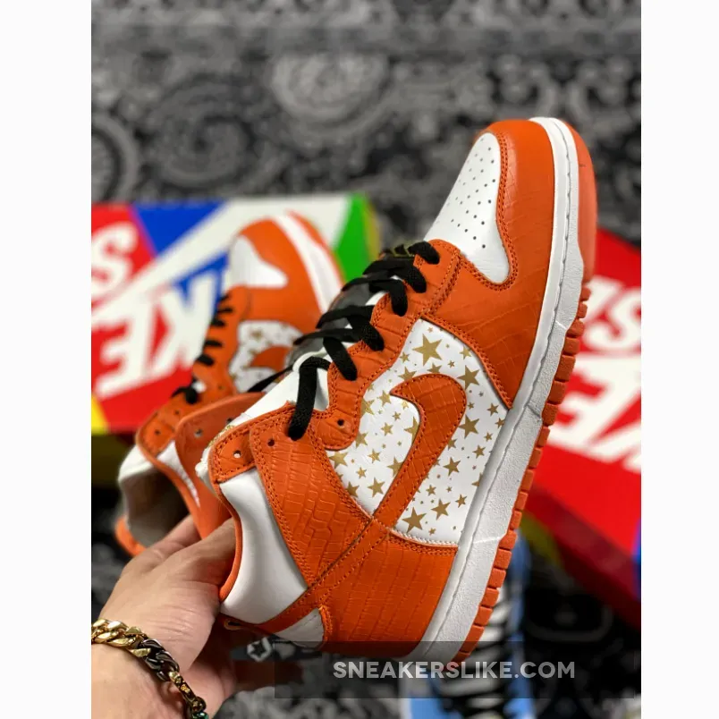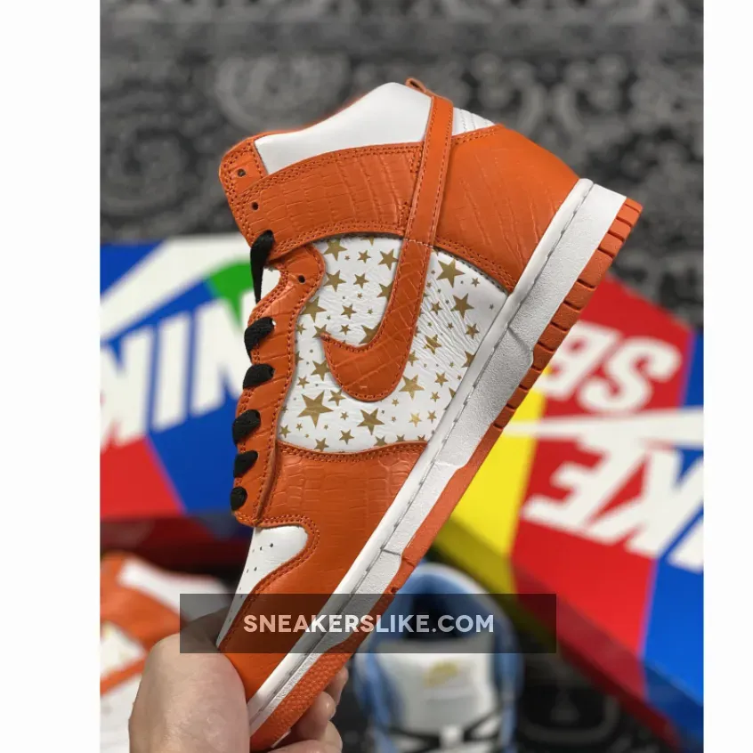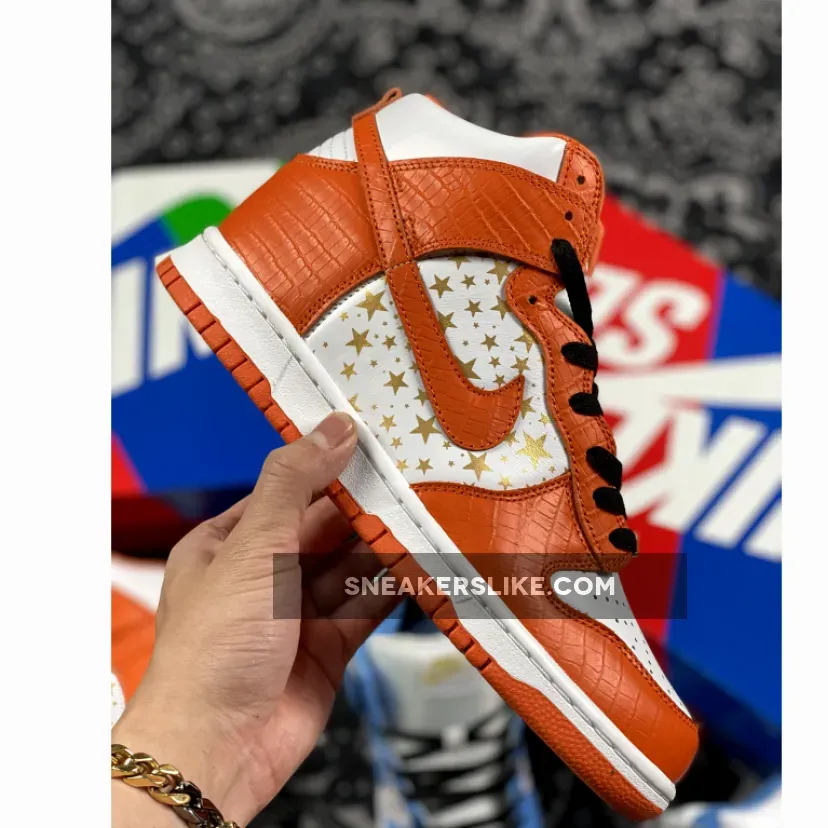 This makes them rather limited and of course highly sought after. It features Zoom Air innersoles, full-grain leather, and croc skin. The gold stars also define this shoe, as they surround the orange swoosh. A highly notable and obvious feature is the metal Supreme tag at the base of the lace.