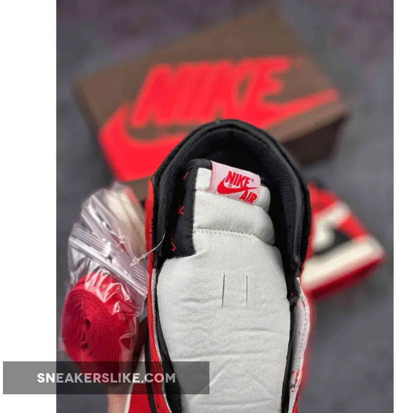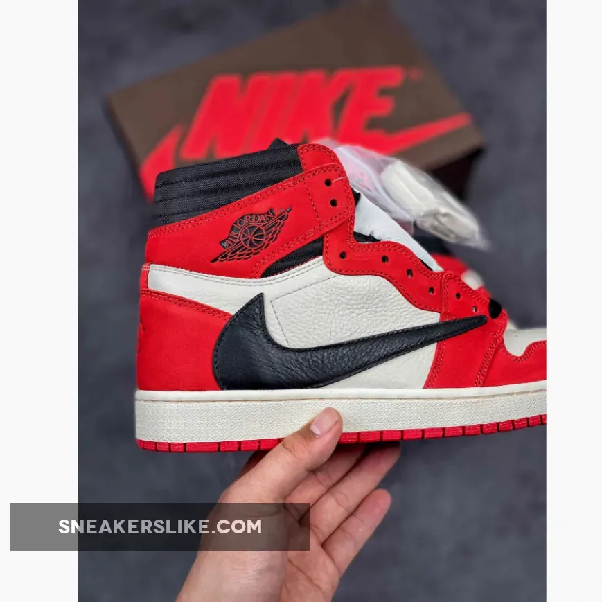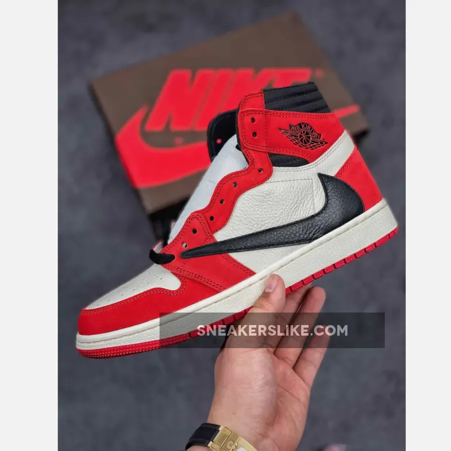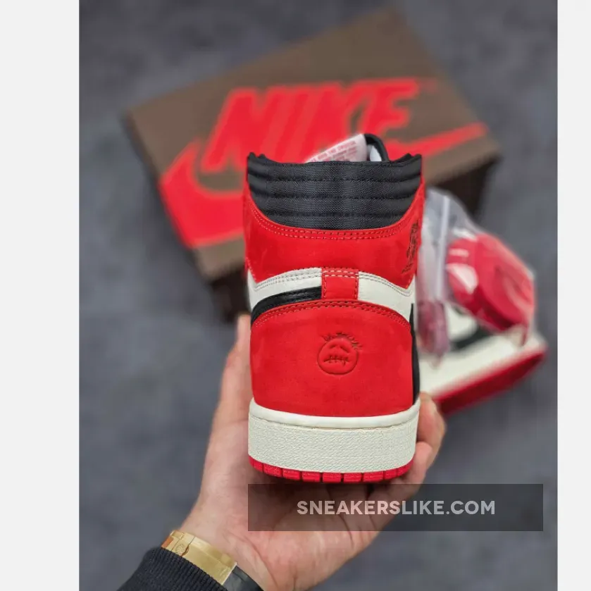 The white leather base can be recognized by the side panels that reach all the way to the heel and the white toe box. Red overlays are placed over it, which complement the red outsole. Travis’s well-known feature, the inverted Swoosh, is accentuated by the colour-matching black laces. In addition, this version will also come with the typical Cactus Jack branding.