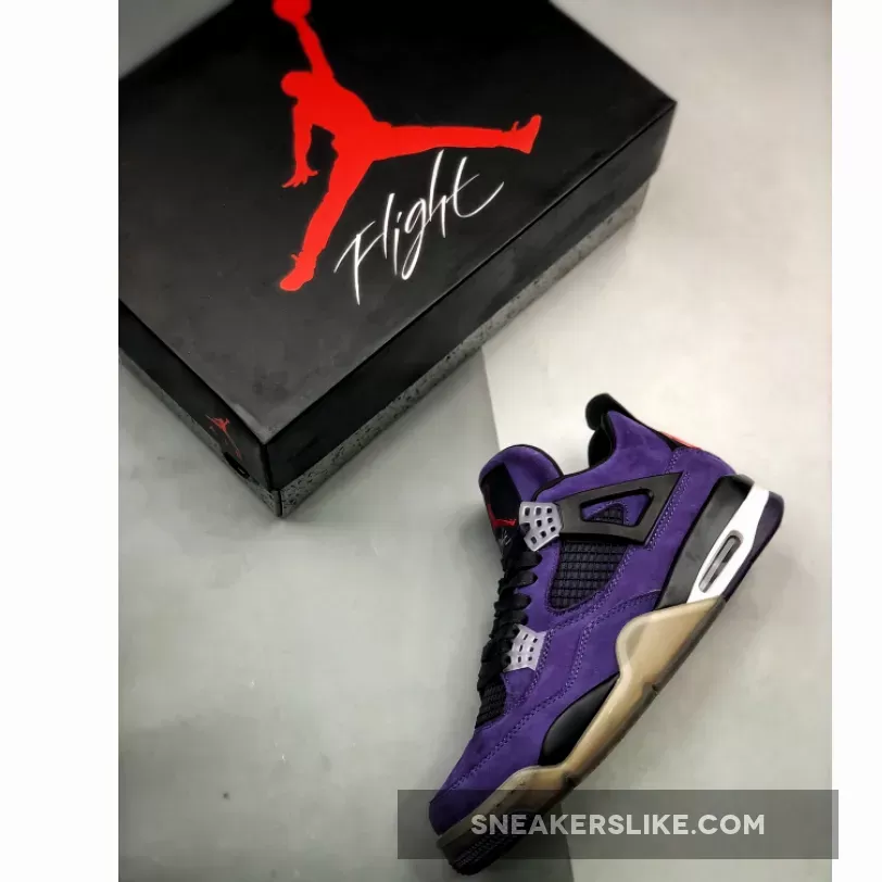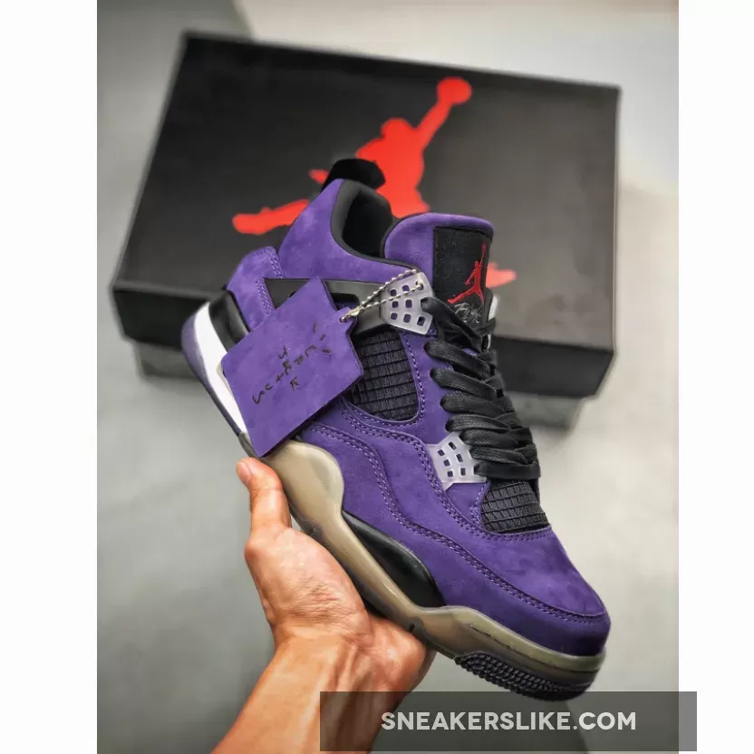 thanks to Bloody Osiris, we get a look a third colorway of the Air Jordan 4 that comes dressed in Purple. This pair features a full Purple nubuck upper with Grey and Black detailing throughout. It even includes the Travis Scott x Air Jordan hangtag, which nods to the collaboration.