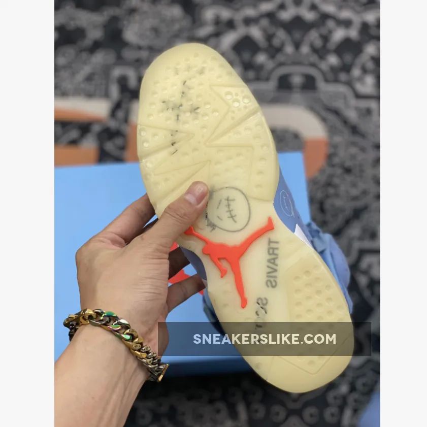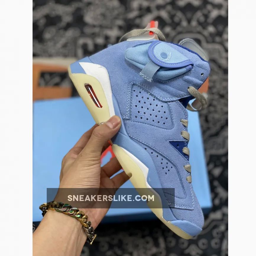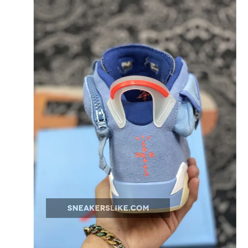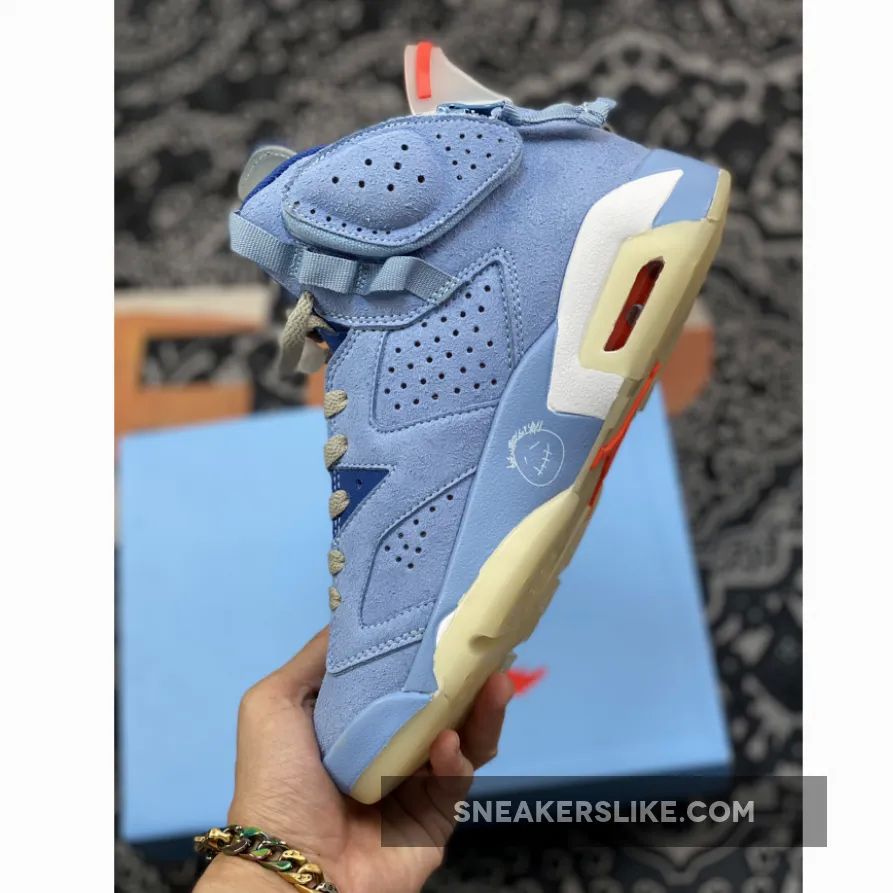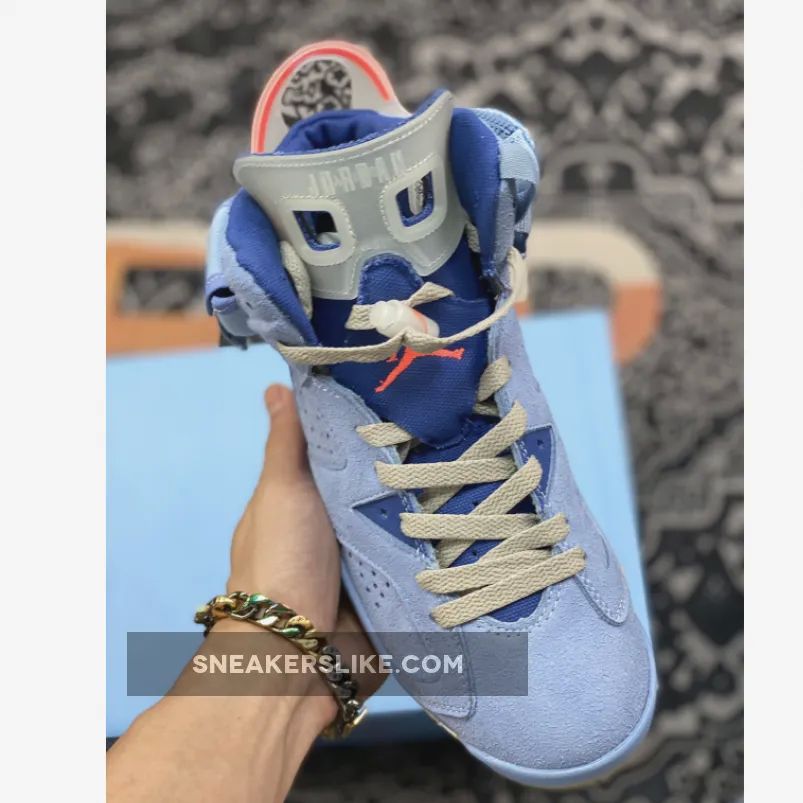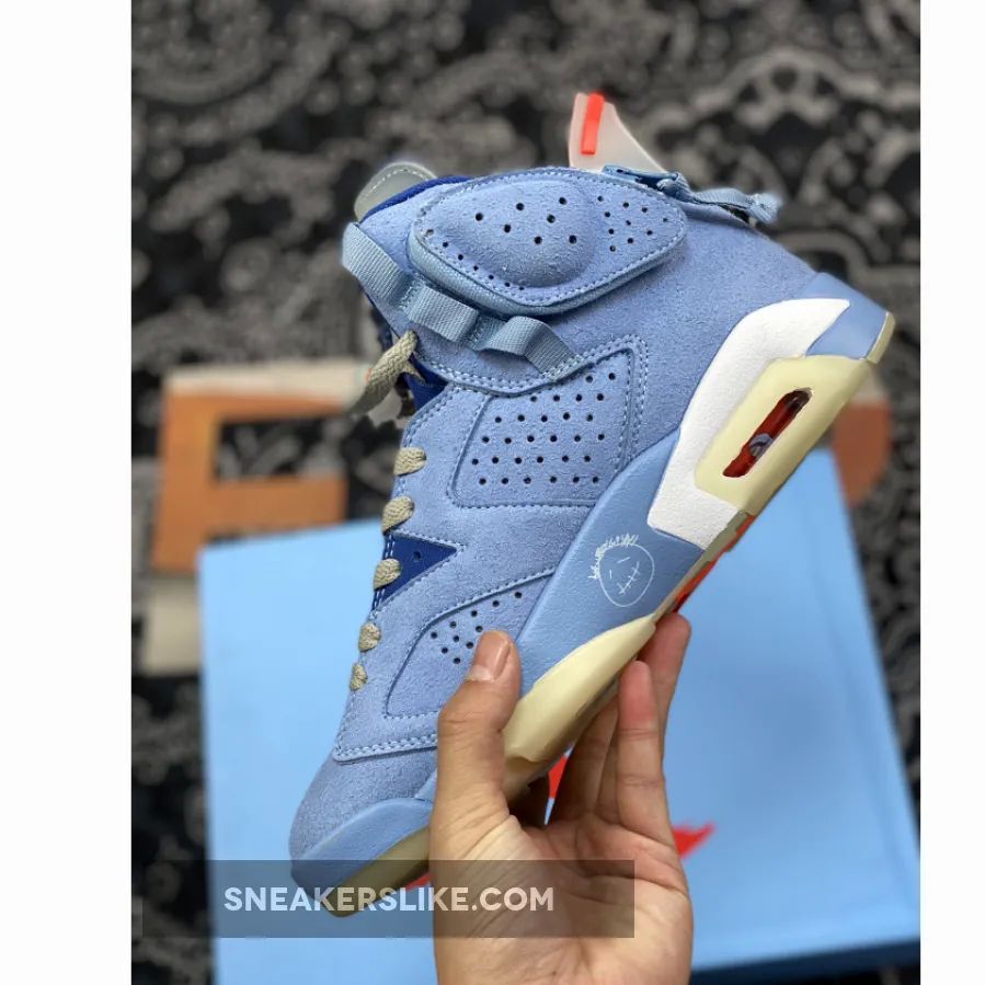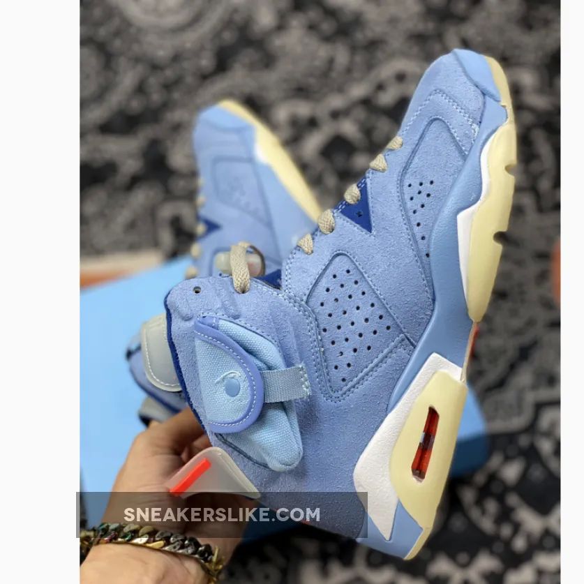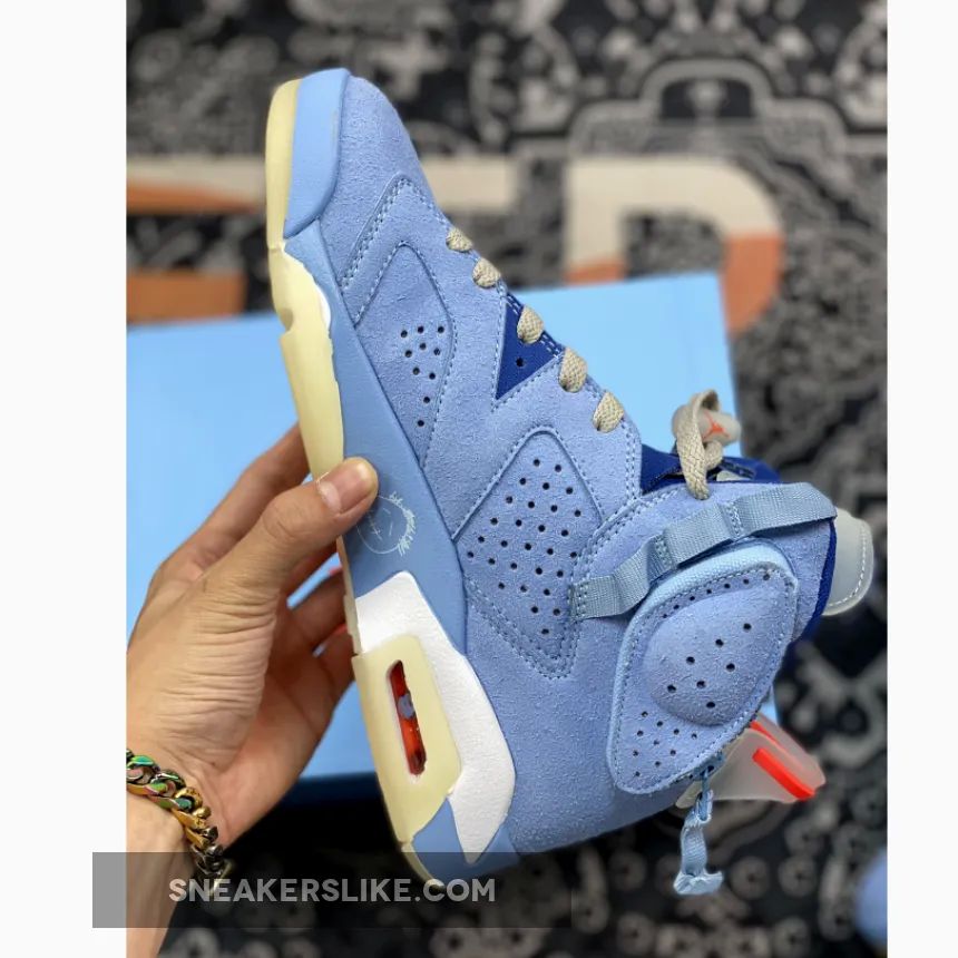the Travis Scott x Air Jordan 6 “Houston Oilers” shares a palette familiar to fans of the football franchise, arriving clad in bright blue suede in a shag similar to that seen on Scott’s recent “British Khaki” release. Midsoles share the same hue, whilst eyestays, tongues, and shrouds all feature a royal canvas finish.