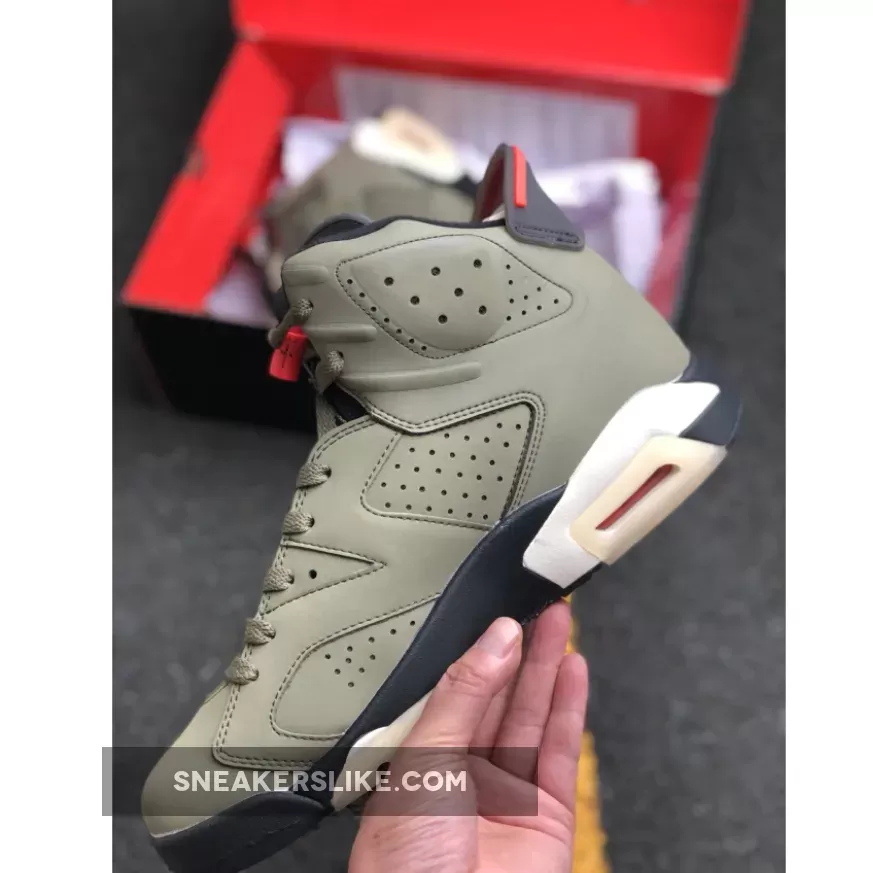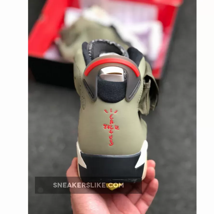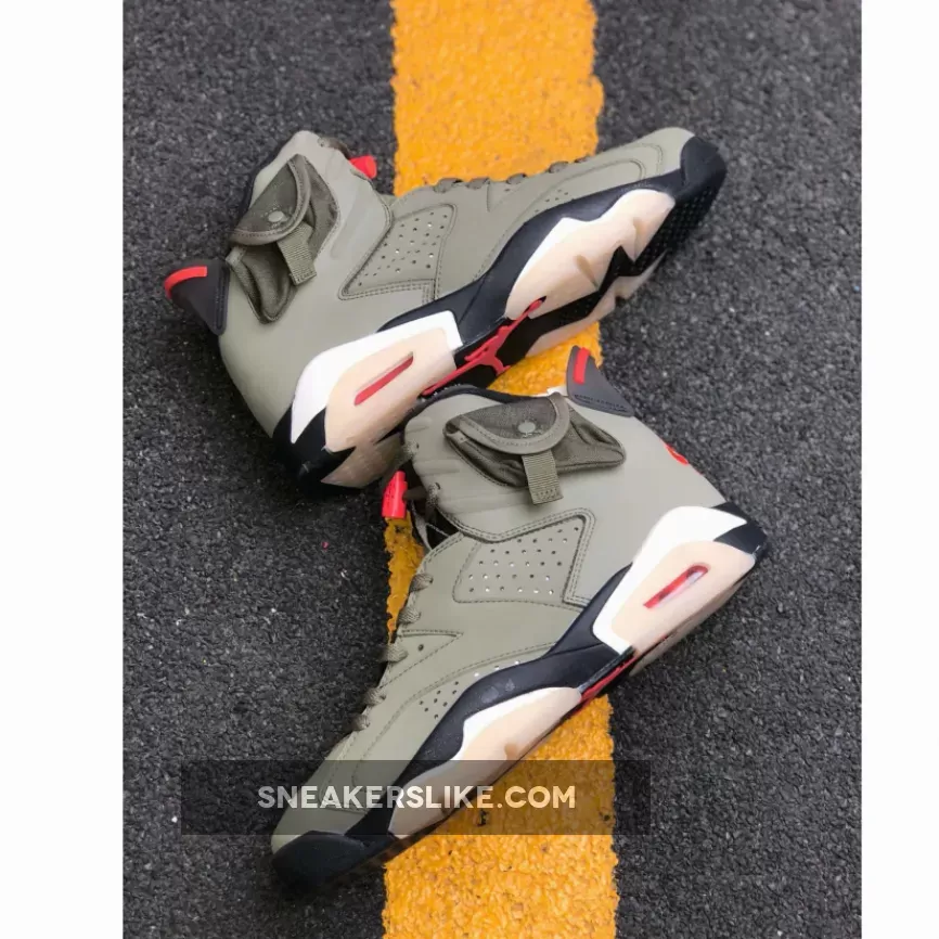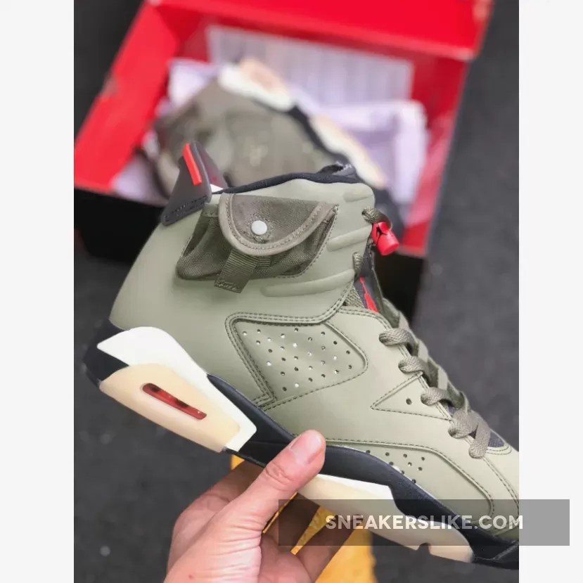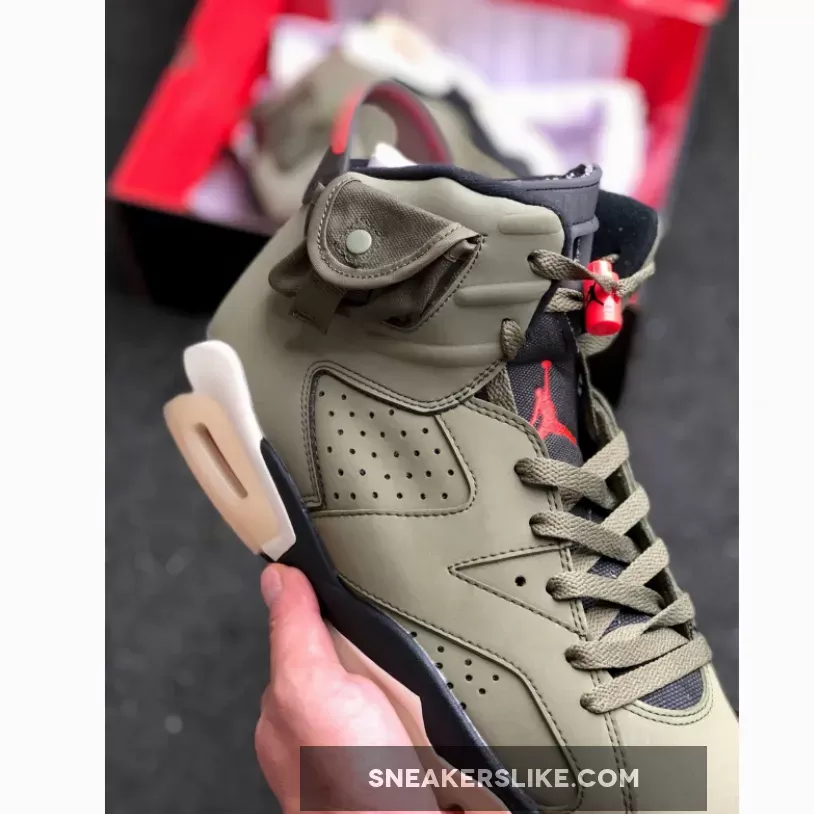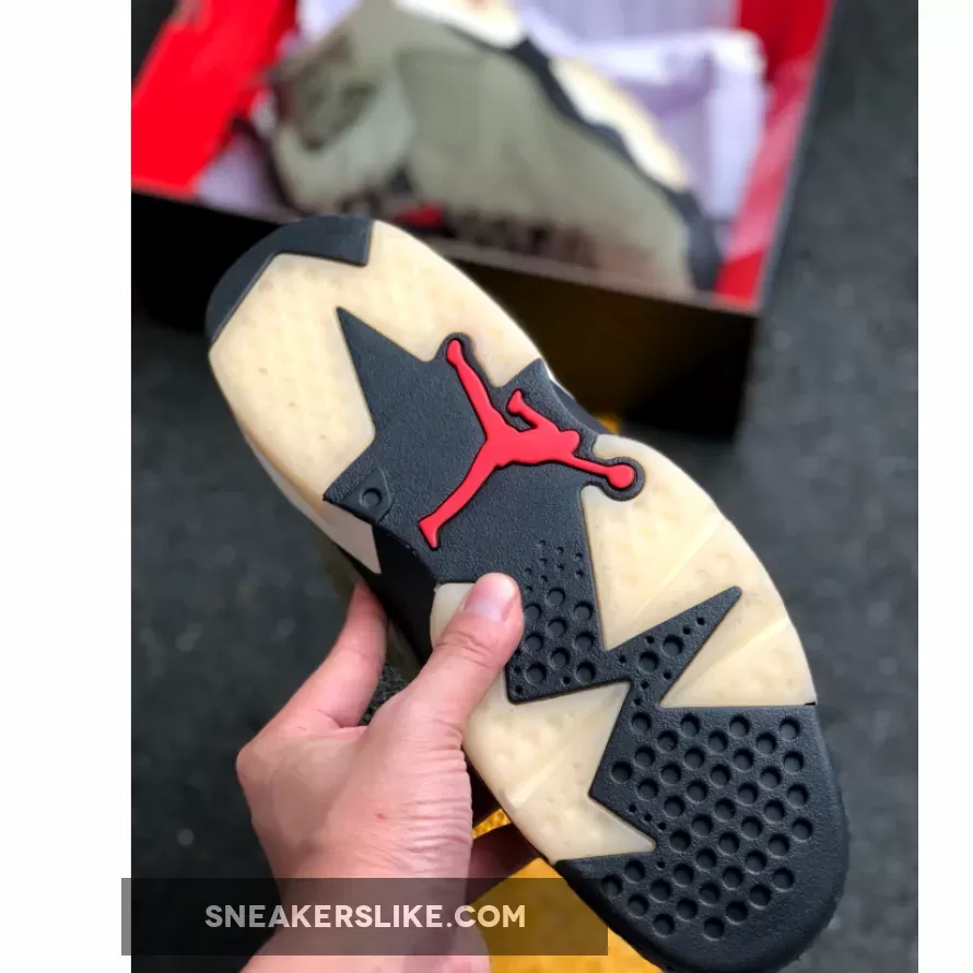 The Travis Scott x Air Jordan 6 Retro ‘Olive’ represents a collaboration between the Houston based rapper and Jordan Brand. This take on the AJ 6, which Scott debuted while performing during halftime of Super Bowl 53, released in October 2019. It features a Medium Olive, black, Sail and University Red colorway along with several unique elements: a small pocket with a snap on the collar, a nubuck and suede upper, Scott’s ‘Cactus Jack’ logo on the heel and a glow-in-the-dark translucent outsole.