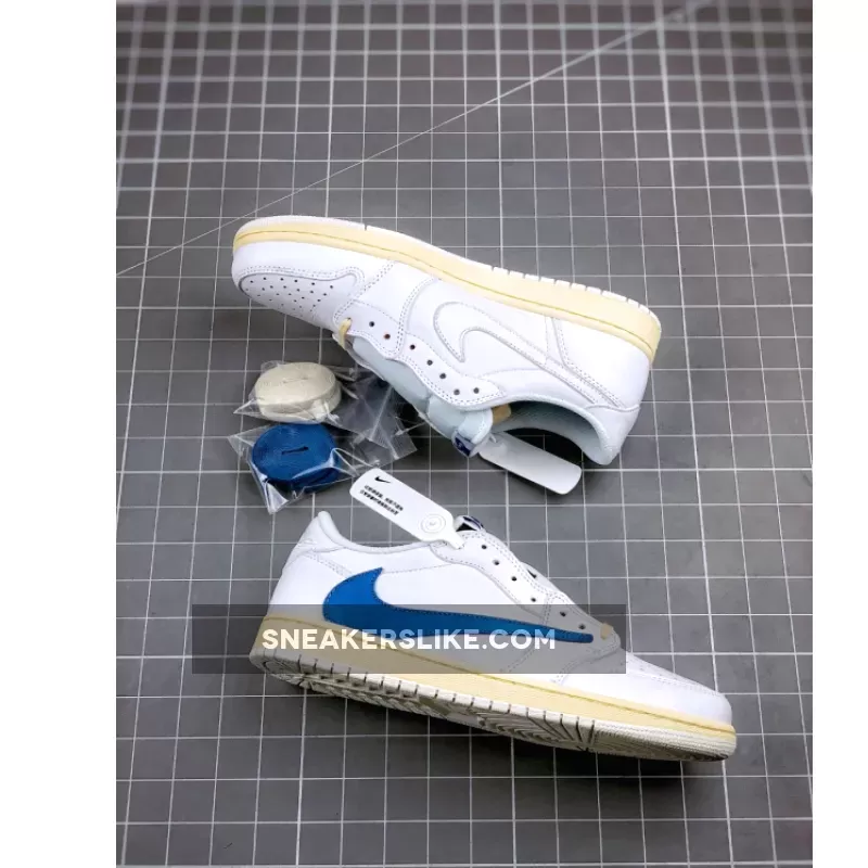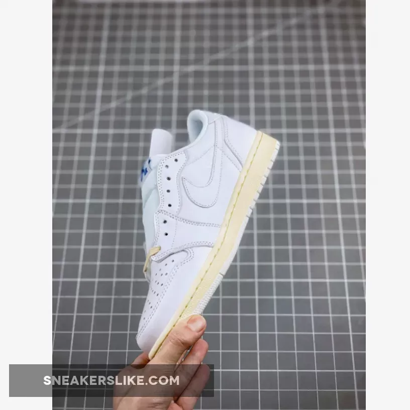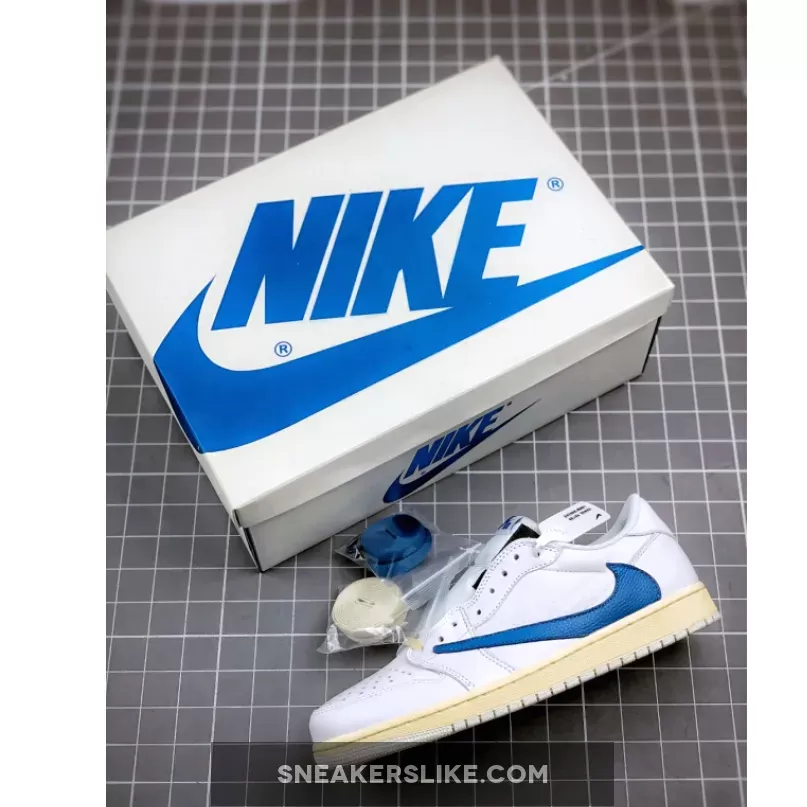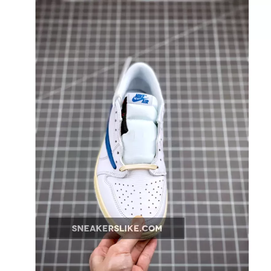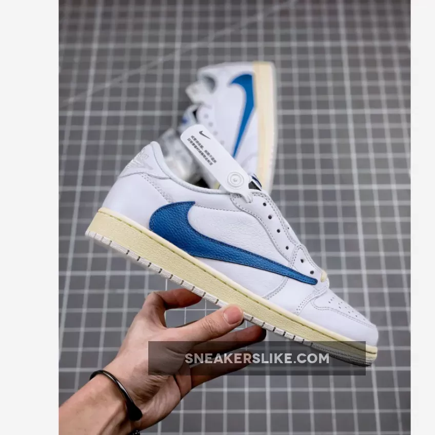 The Travis Scott x fragment design Air Jordan 1 Low OG “White/Blue/Sail” features a premium white leather upper accented by contrasting bright blue reversed Swooshes at the midfoot. Rounding up the design of the shoe are off white-colored laces and matching midsoles paired with pure white rubber outsoles.