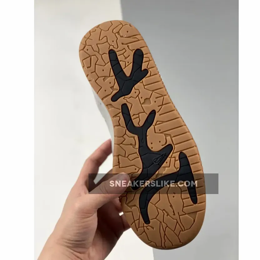 The sneaker looks to boast a full-suede upper, with black adorning the base, grey on the overlays. The swoosh logo on the tongue features the characteristic brown of the collaboration between Jordan and Travis. We find an inverted swoosh, signature of the collaboration, in white leather. The sole is made of transparent rubber, and reveals the word “JACK” on the sole, nickname of the American rapper.