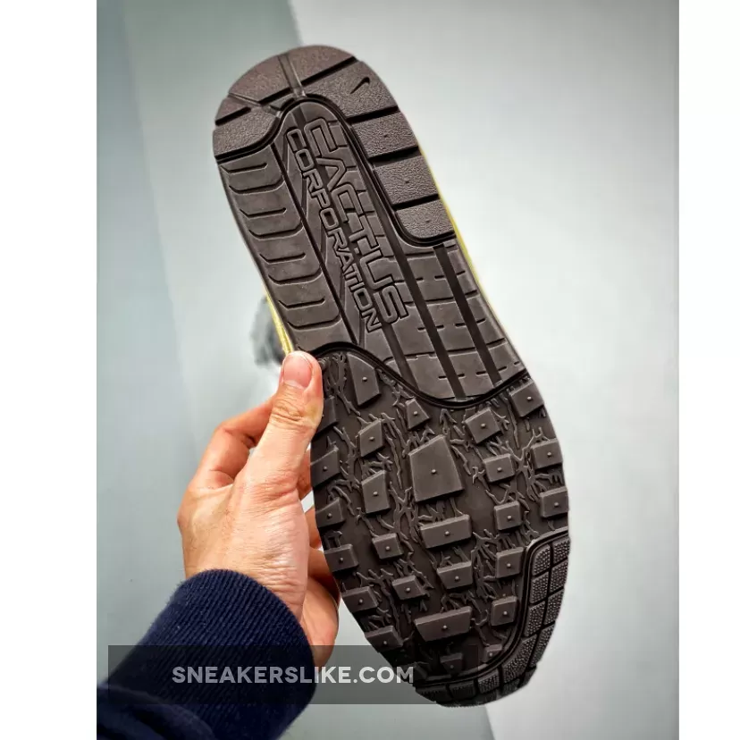 The Travis Scott x Nike Air Max 1 Cactus Jack Baroque Brown is anything but ordinary. Bold but wearable nonetheless, this pair created with the American rapper is a great addition to any wardrobe. It features a vibrant lemon yellow mesh base that’s reinforced by tan and dark brown leather overlays. Adding more flair to the already eye-catching design of this Air Max 1 is the flipped textured Swoosh that goes well with the printed fabric garter details and the red rope laces. Snag these and level up your style.