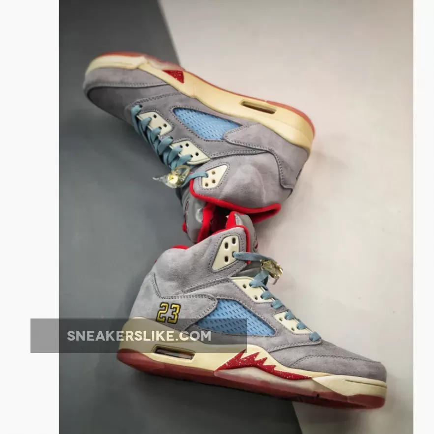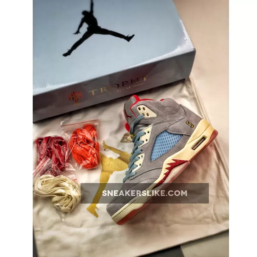 One pair features an Ice Blue upper with University Red accents atop a Sail midsole, while the other sports a University Red upper with Ice Blue accents atop a Black midsole. Both are completed with Trophy Room branding and embroidered number “5” on the heels atop icy translucent outsoles.