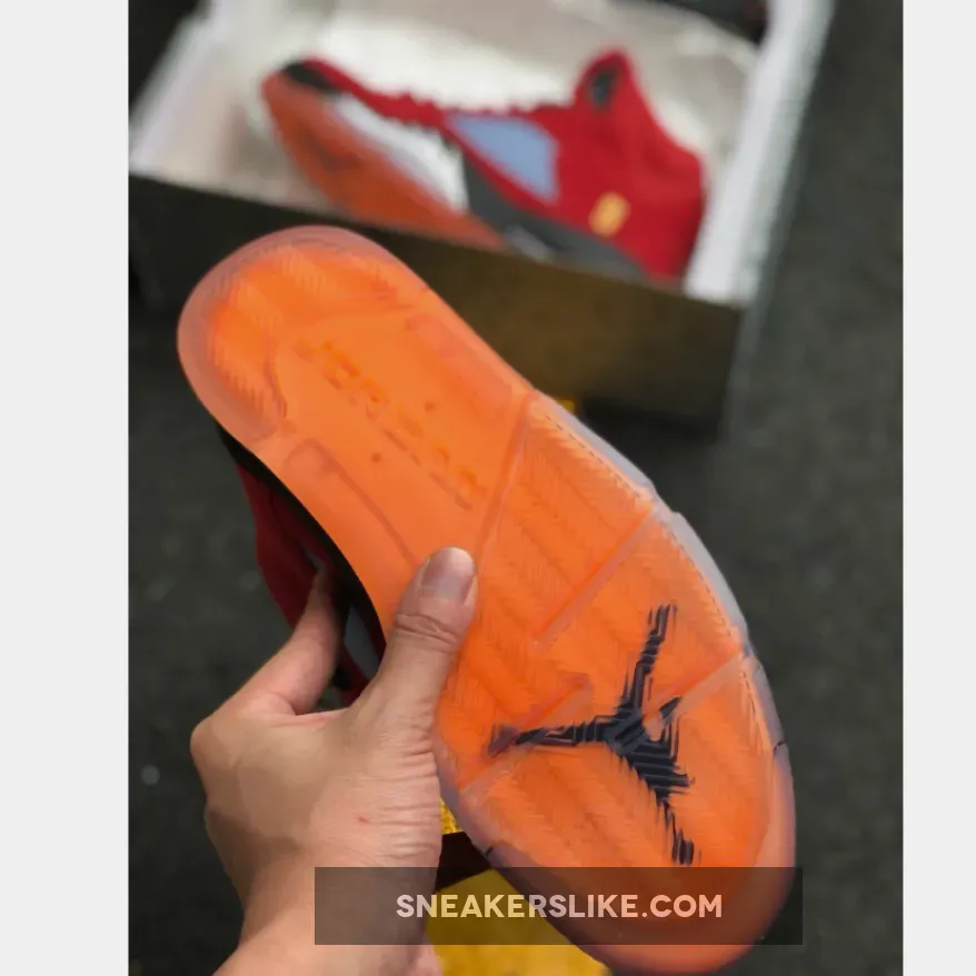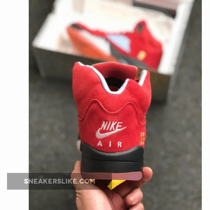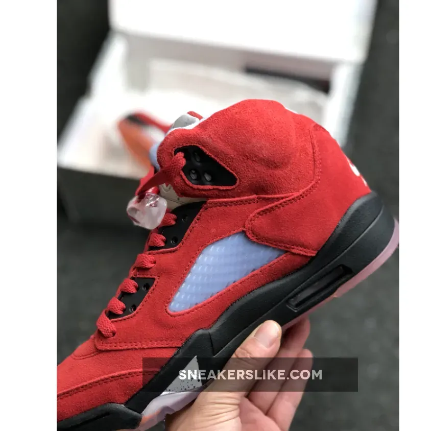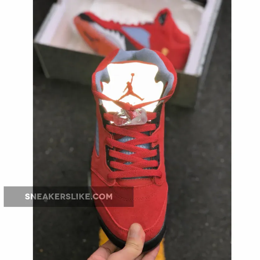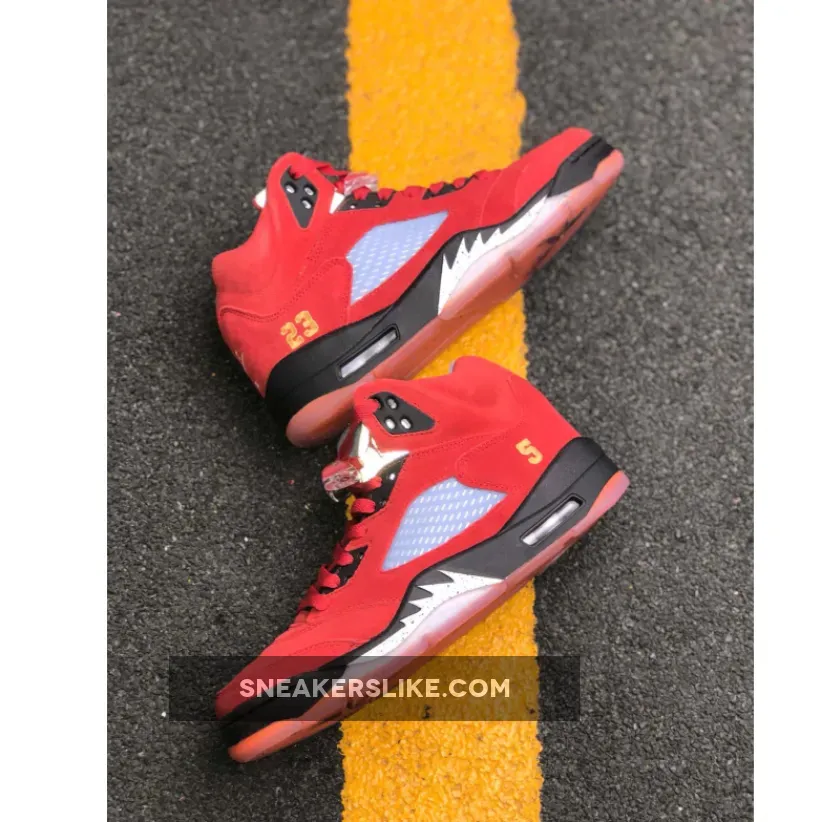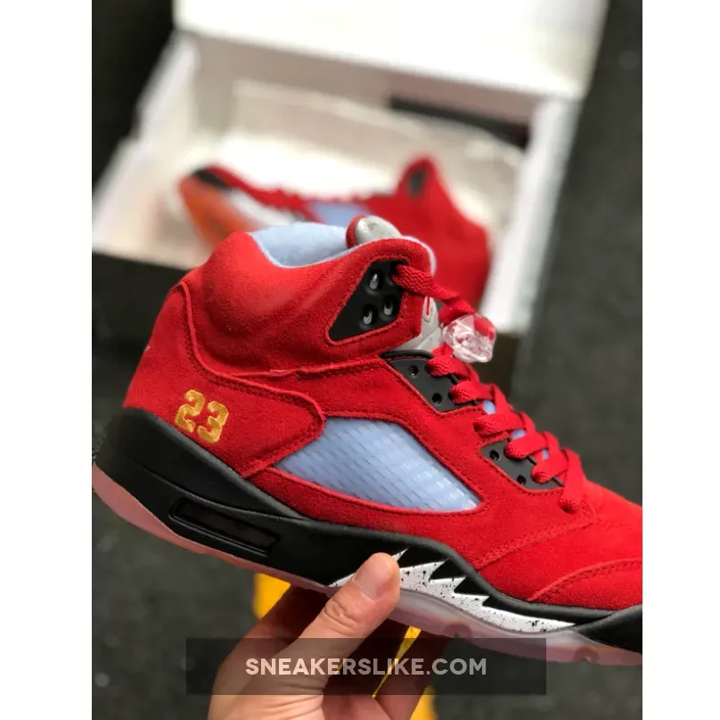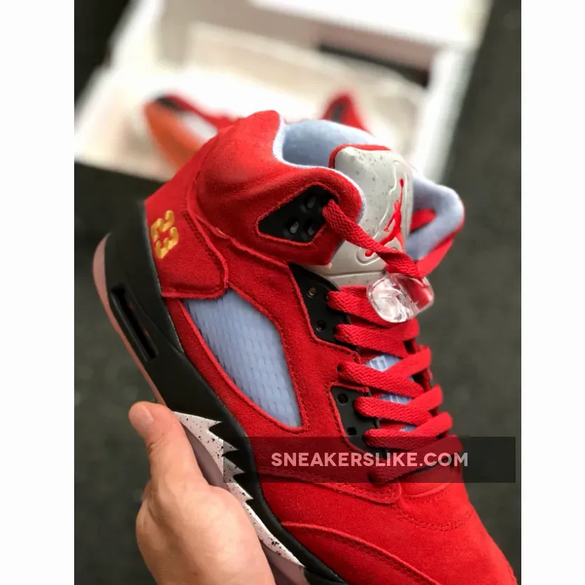One pair features an Ice Blue upper with University Red accents atop a Sail midsole, while the other sports a University Red upper with Ice Blue accents atop a Black midsole. Both are completed with Trophy Room branding and embroidered number “5” on the heels atop icy translucent outsoles.